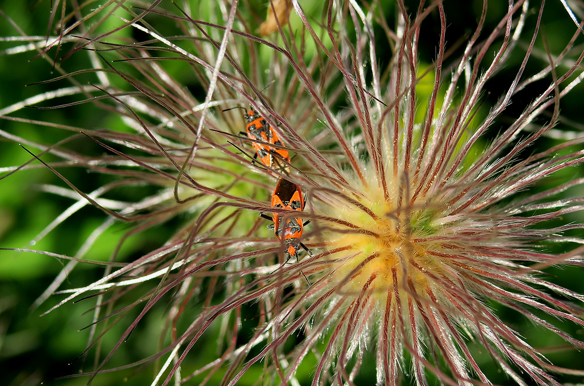 An den Fruchtständen der Küchenschelle (Pulsatilla vulgaris) saugt eine Wanzenart, die an die Ritterwanze erinnert, aber wohl die Zimtwanze (Corizus hyoscyami) ist.