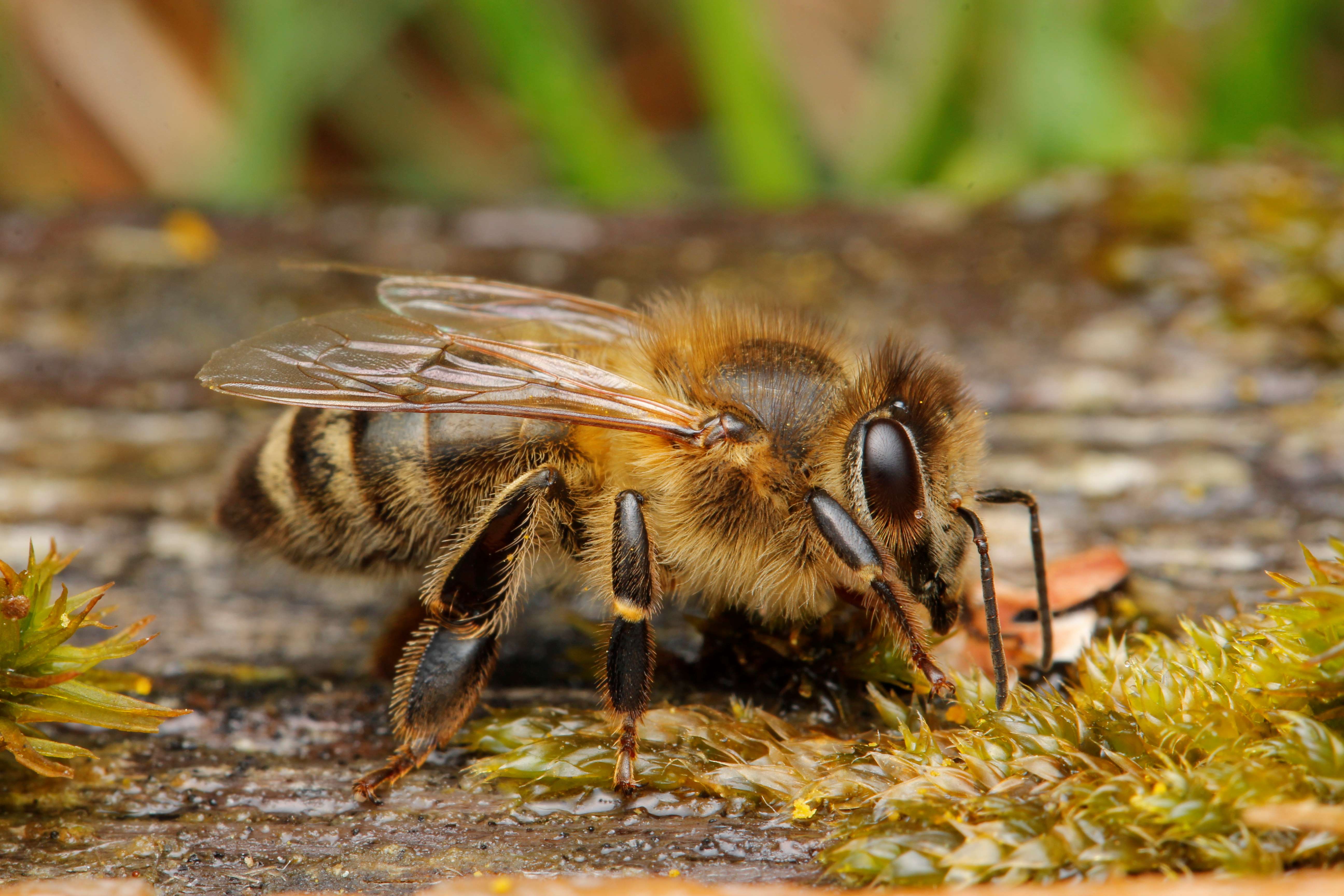 Zum Dank für Fleiß und Honigproduktion ein gelungenes Foto: Sohn Roman Borovsky hat eine seiner Bienen beim Wassertrinken fotographiert (Kärntner Biene, Apis mellifera carnica) im Steirischen Randgebirge auf 900m Seehöhe (Österreich)