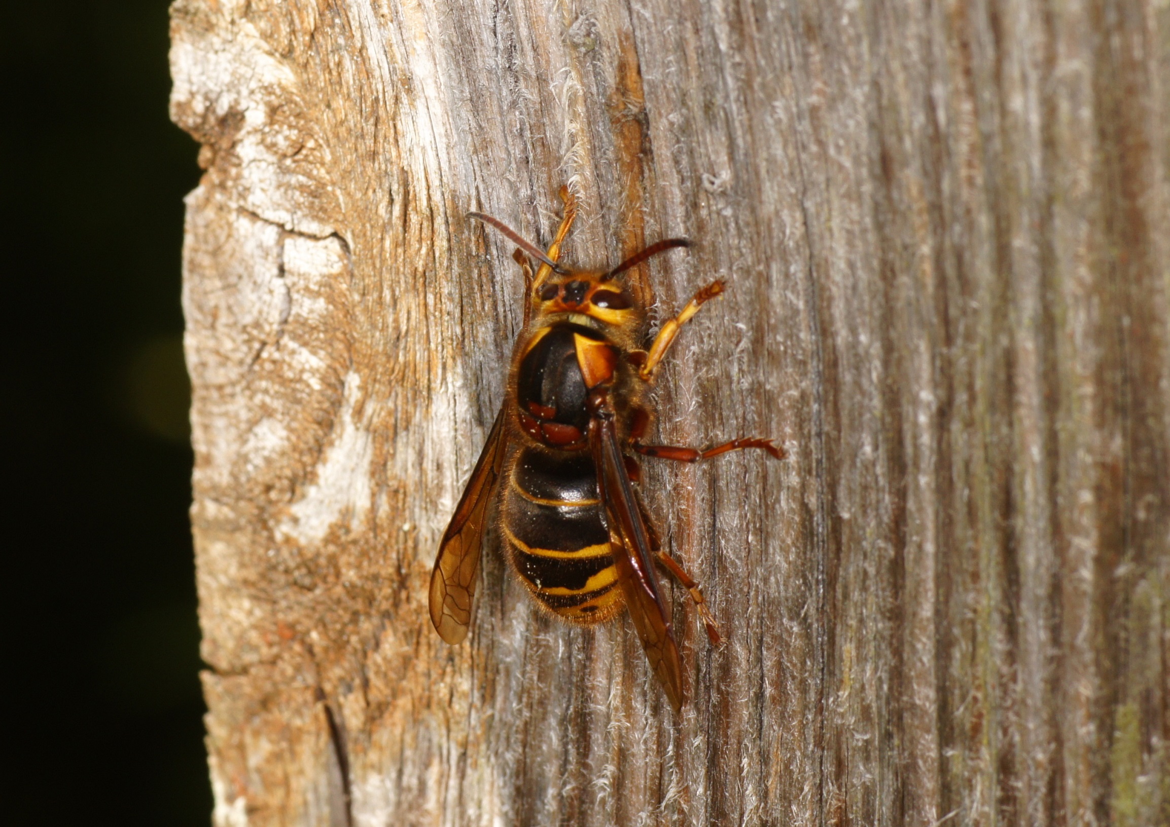 Eine Jungkönigin von Vespula media. Für mich ist sie die schönste Vespula-Art und bei uns im Vergleich zu den anderen Wespen selten. Sie schabt von verwittertem Holz Material für den Nestbau ab.