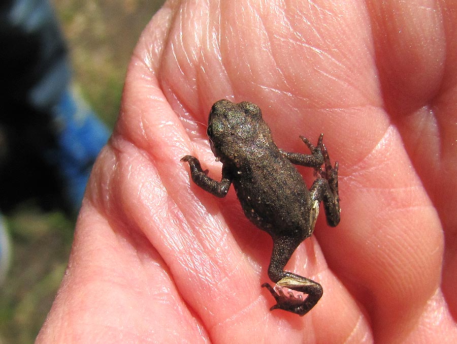 Gestern, 28.Juni 15, auf einer kleinen Wanderung bei der Thomashütte (Nähe Messel mit der berühmten Fossilienfundstätte) trafen wir auf Hunderte von ganz jungen Erdkrötchen, die wohl gerade aus den nahe gelegenen Teichen gekrochen waren und sich nun im Wald verteilten. Damit der kleine Enkel das Tierchen genau sehen konnte, musste man es halt mal kurzfristig auf die Hand nehmen. - Leider enden bereits viele dieser am dunklen Boden schwer sichtbaren Babys unter Wanderstiefeln und Fahrradreifen. :(