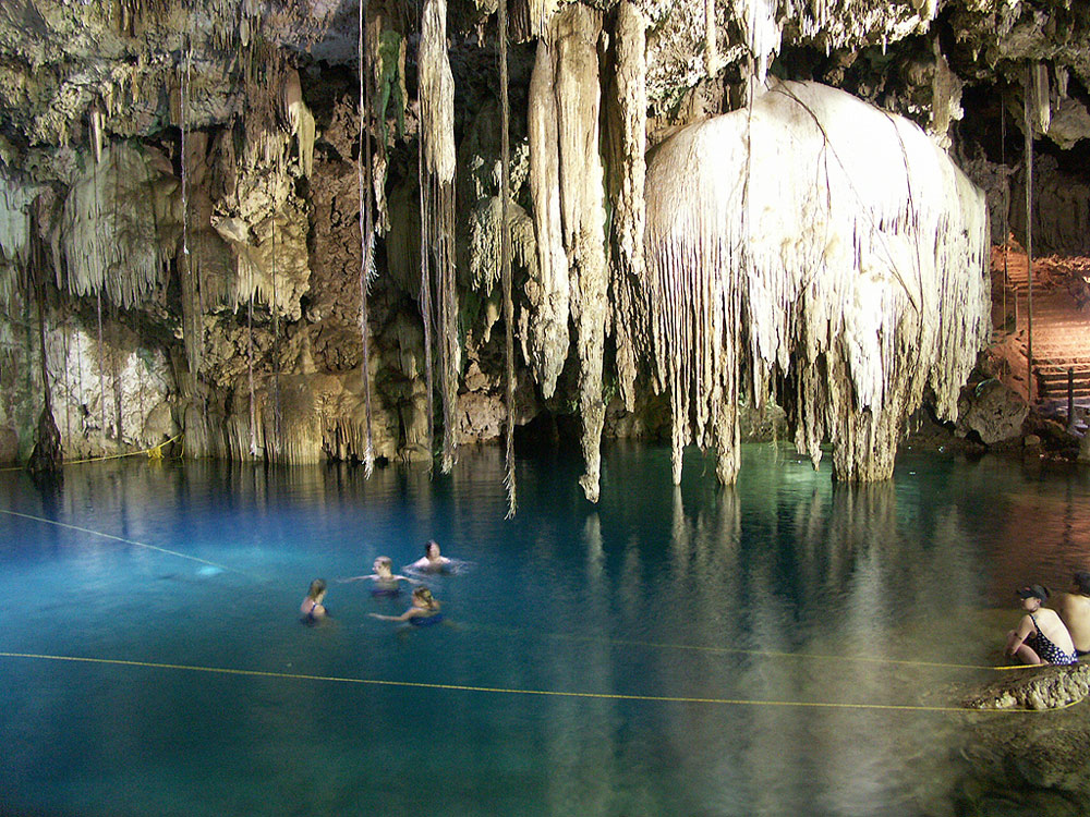 Die mexikanische Halbinsel Yucatan ist ja weithin ein Karstgebiet, durchzogen von Höhlen und unterirdischen Wasserläufen, ähnlich wie das gegenüber liegende Florida. Dank Absenkung des Meeresspiegels um ca. 100 m in der letzten Eiszeit reichen die Höhlen samt Tropfsteinen heute bis weit unter den Meeresspiegel. Mit dem Wiederanstieg der Meere am Ende der Eiszeit liefen sie voll Wasser, wobei in diesen sog. Cenoten vielererorts sehr attraktive Badeplätze entstanden:
