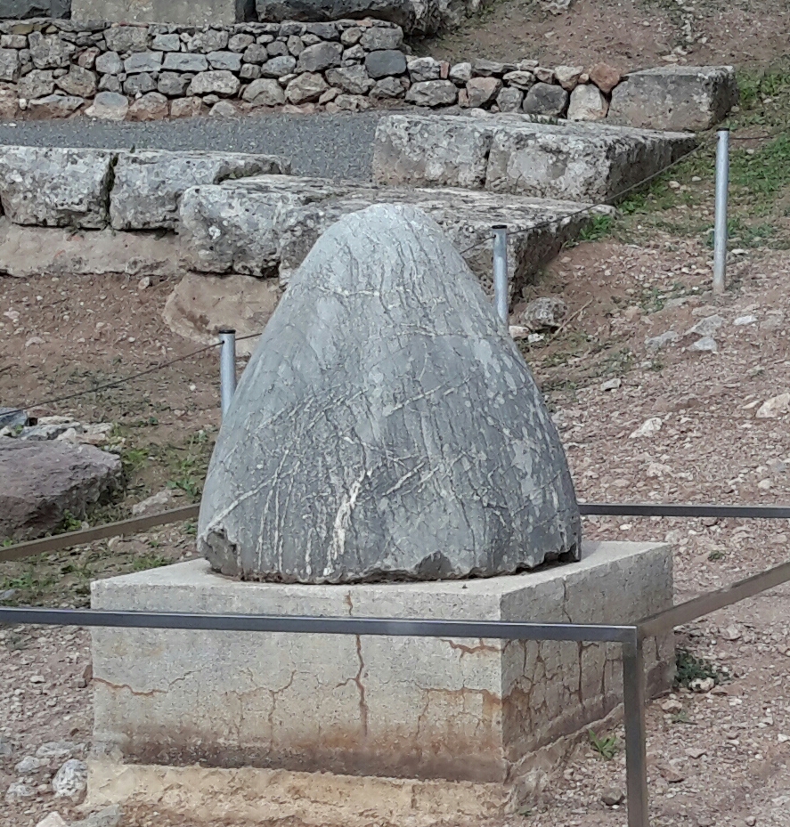Dem Mythos zufolge ließ Zeus zwei Adler von je einem Ende der Welt fliegen, die sich in Delphi trafen. Seither galt dieser Ort als Mittelpunkt [Nabel] der Welt.