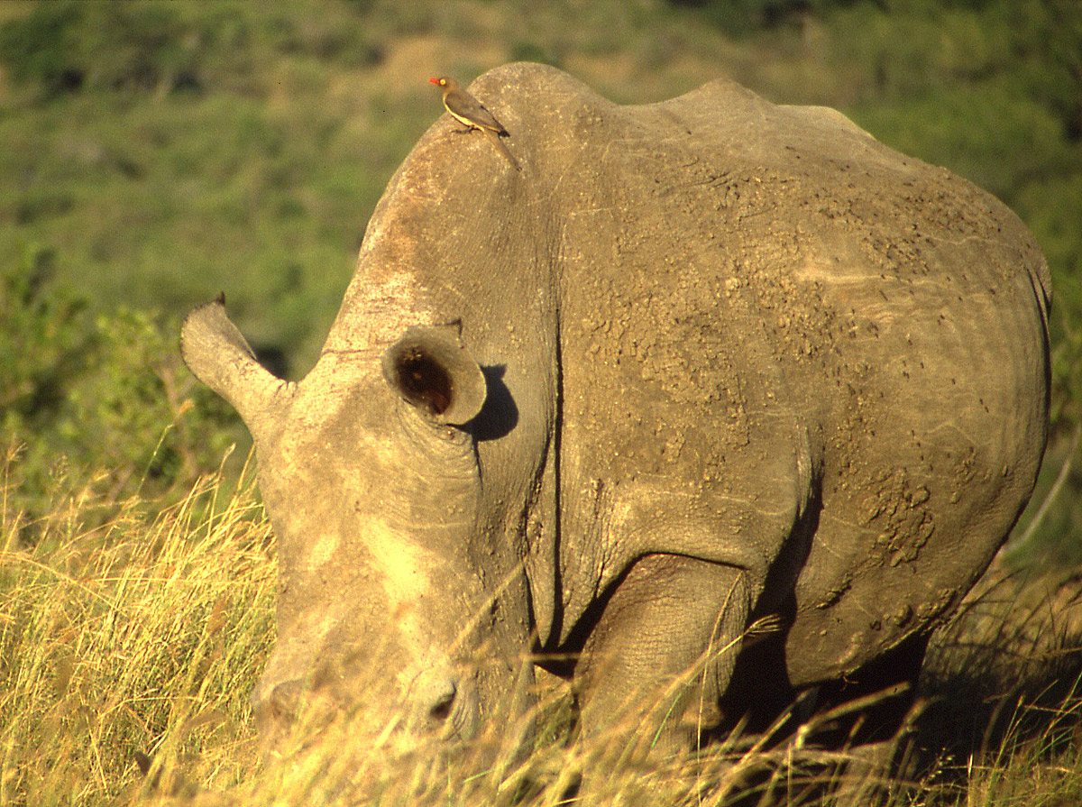 Hier sitzt ein Rotschnabel-Madenhacker (Buphagus erythrorhynchus) auf einem Rhino im Hluluwe-iMfolozi-NP von Südafrika.