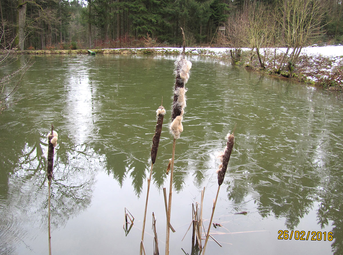 Heute war’s noch nichts: Der Teich war wieder aufgefüllt, doch ringsum lagen Schneereste, und auf dem Wasser befand sich eine dünne Eiskruste.