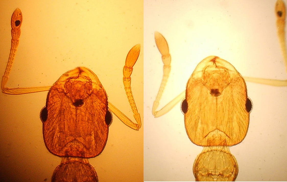 Der Kopf einer Arbeiterin, links von oben aufgenommen, rechts von unten. Der Inhalt der Infrabuccaltasche liegt genau vor der eigentlichen Mundöffnung. Der Kopf ist einschließlich der Augen 0.6 mm breit.