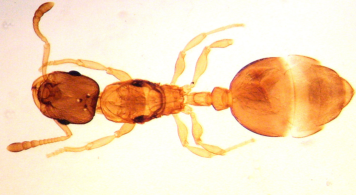 Zwei Arbeiterinnen von Temnothorax unifasciatus in einem fast durchsichtigen Dauerpräparat, bei durchscheinendem Licht. Etwas vor den schwarz pigmentierten Augen ist in der Mittellinie des Kopfes eine dunkle Masse zu erkennen: Der Inhalt der Infrabuccaltaschen!