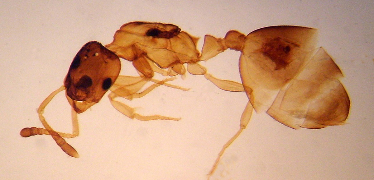 In der Seitenansicht sei auf die kurzen, fast dreieckigen Epinotaldornen hingewiesen (nur einer ungefähr in der Schärfenebene). Im Kopf dieses Exemplares, kurz hinter dem Clypeus, befindet sich hier eine recht große dunkle Masse in der Infrabuccaltasche.