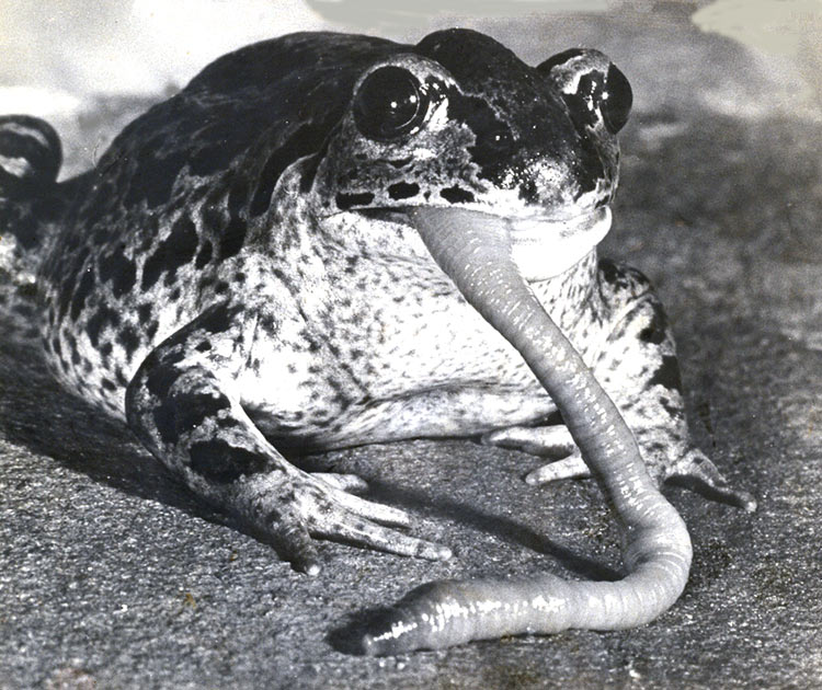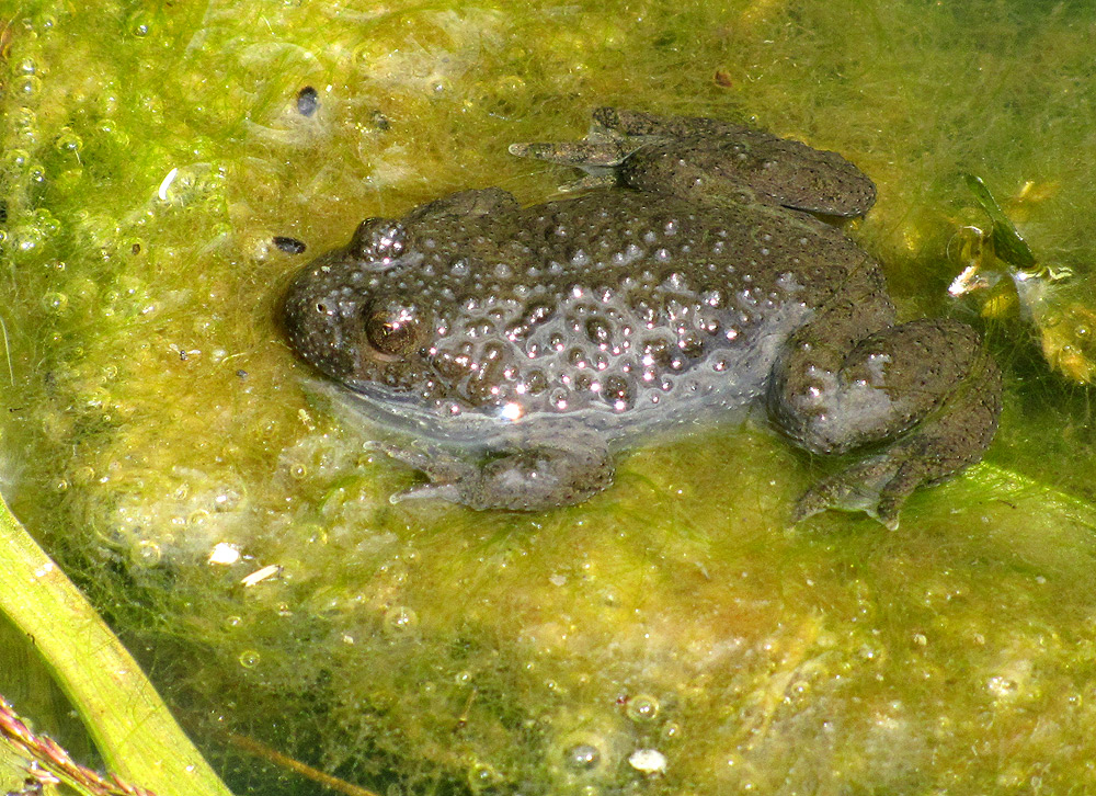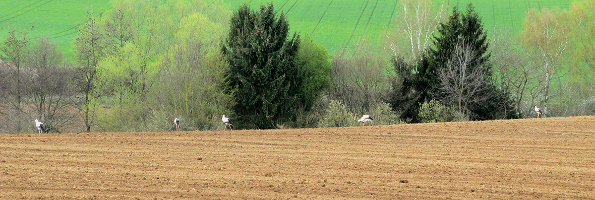 Da kann mich nur trösten, dass die Störche wohl auch weitere Nahrungsquellen nutzen: Wie berichtet, sahen wir gegen 10 Störche hinter einem Traktor mit Egge auf dem kahlen Acker einher staksen. Da haben sie weder Frösche noch Reptilien finden können, und ich nehme an, dass sie dort hauptsächlich Regenwürmer geerntet haben! Die dürften auch in den großen, feuchten Wiesenflächen des NSG nicht selten an die Oberfläche kommen.