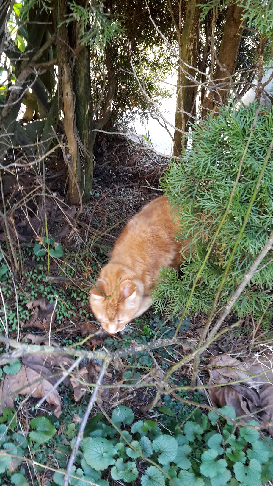 Da wir es gerade von Katzen hatten, die Täter und Opfer zugleich sind, geb ich mal hier ein Foto unseres Katers, er ist 19 Jahre alt und gerade auf Pirsch. Aber Vögel erwischt er nicht mehr. :D