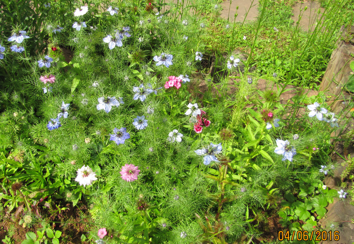 Bärtige Bartnelken (Dianthus barbatus) stehen inmitten heiratslustiger Jungfern im Grünen (Nigella damascena).