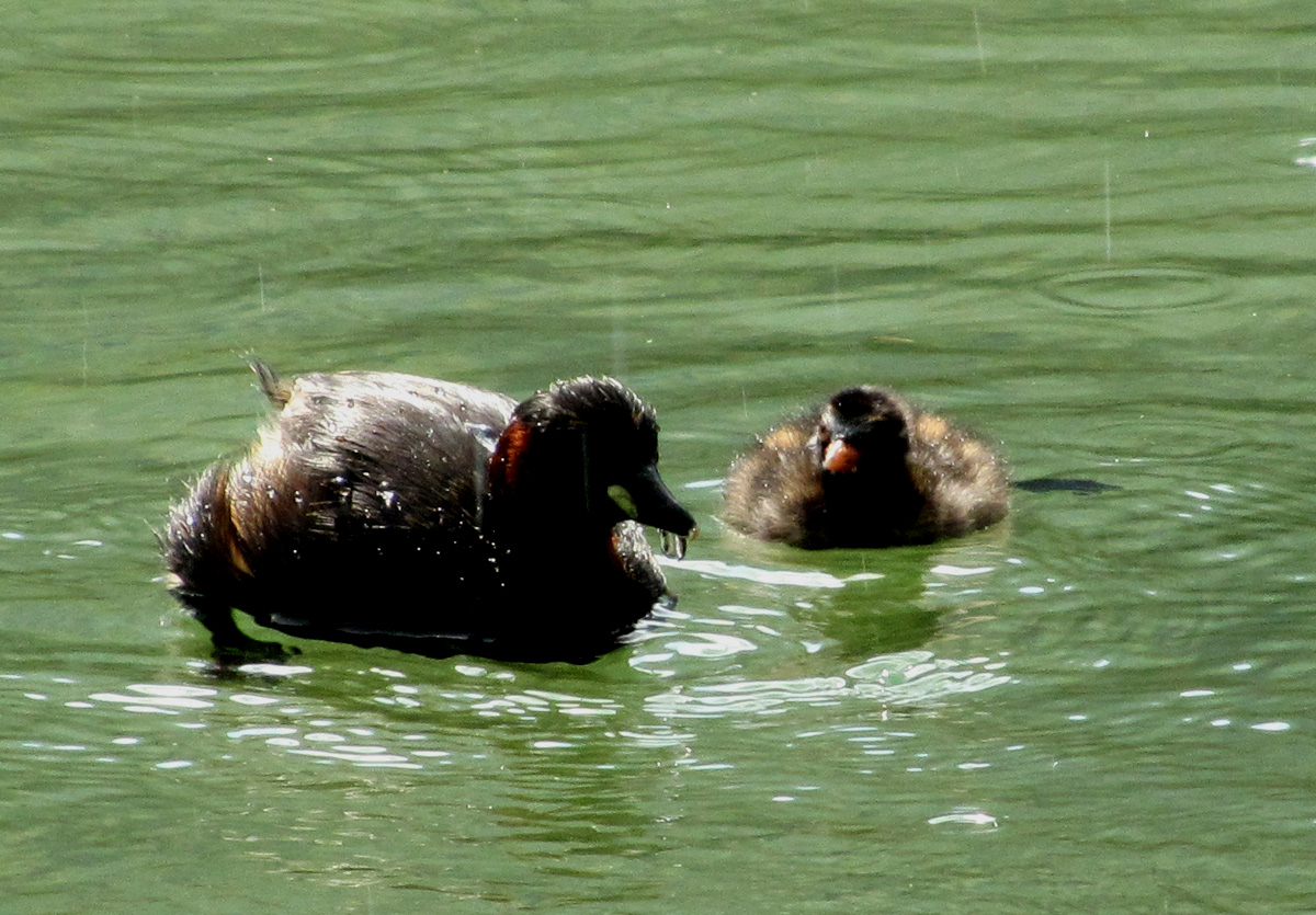 Zwergtaucher (Tachybaptus ruficollis) auf dem Toblacher See, Südtirol, 30.6.2016. Es hat etwas geregnet, aber man konnte die beiden Alten tauchen und überraschend schnell und weit unter Wasser schwimmen sehen, während die zwei Jungtiere oben warteten, dass ihnen Futter gebracht wurde.