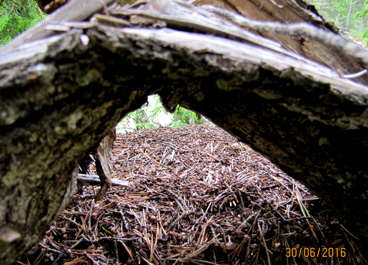 Die Wälder der Dolomiten sind reich an Waldameisen-Nestern. Hier ist es ein Volk von Formica cf. lugubris am Rande eines Wildbaches,