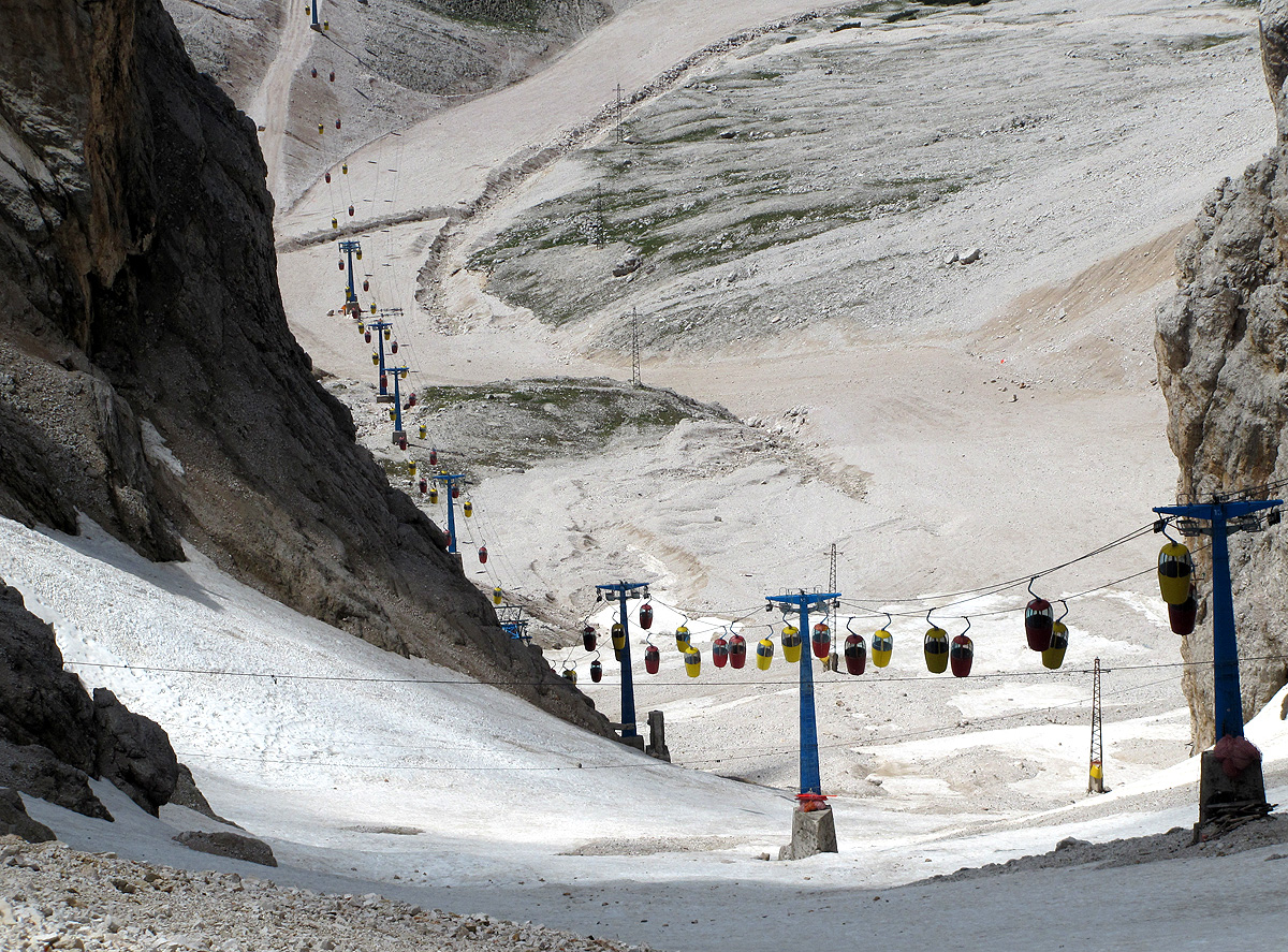 Son Forcia (2215 m), wo man in den oberen Teil umsteigt und zum Rif. G. Lorenzi auf 2932 m geschaukelt wird. Ganz zum Gipfel
