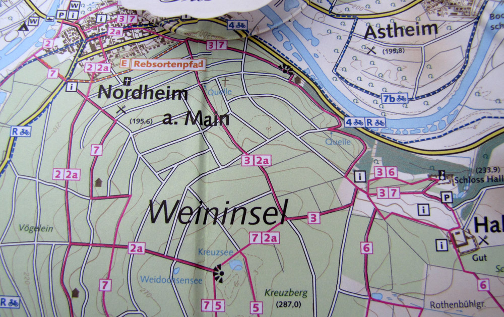 Ein Kanal hat eine der Mainschleifen bei Volkach abgeschnitten. Es entstand tatsächlich eine "Insel", die fast vollständig von Weinbergen