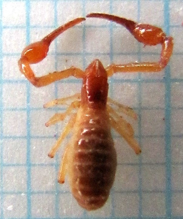 Die Bestimmung der Tiere ist dank einer sehr großen Artenzahl nicht einfach. Hier handelt es sich um einen Verwandten des gewöhnlichen Bücherskorpions, Chelifer cancroides. Bemerkenswert ist die doch beträchtliche Größe des Tieres. Die meisten Arten sind sehr viel kleiner.