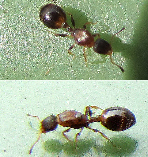 Dunkle Fühlerkeulen, dunkle Schenkel, und im unteren Bild mit etwas Fantasie die relativ dünnen Epinotaldornen.