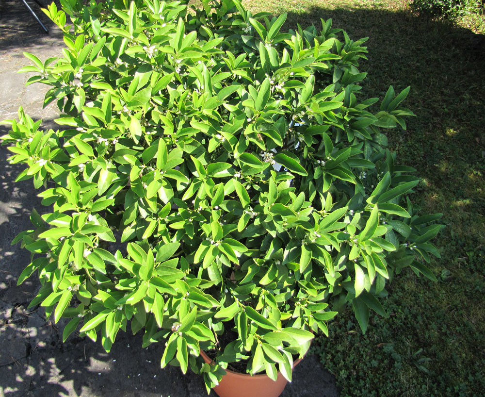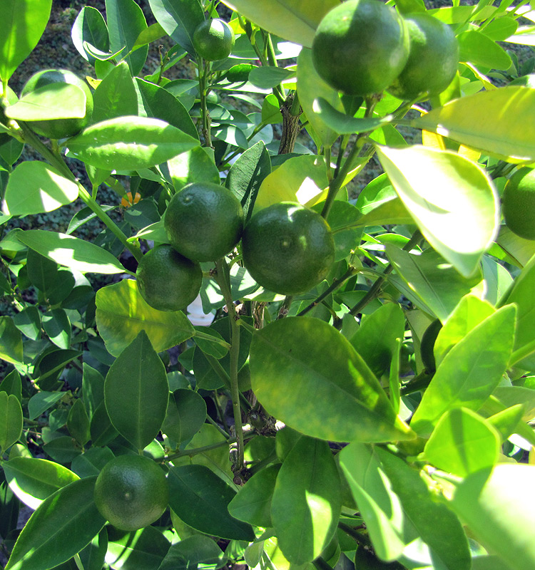 Daneben steht ein Calamandino („Citrus mitis“) mit noch grünen, aber schon recht stattlichen Früchten.