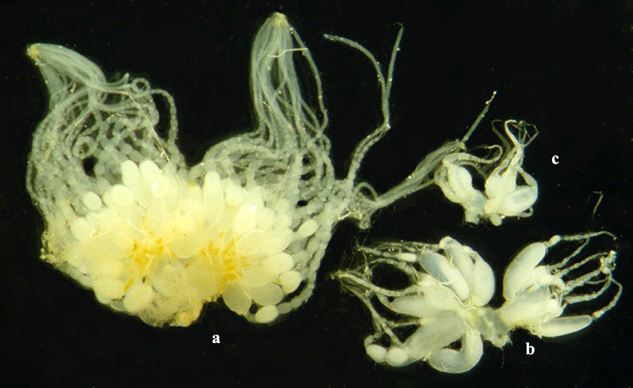 bereits abgelegter Eier („Gelbkörper“, corpora lutea). b = Ovarien einer großen Arbeiterin; c = Ovarien einer kleinen Arbeiterin.