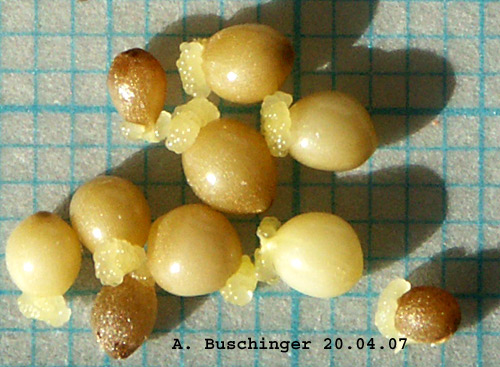 Die Samen tragen ölreiche Anhängsel, Elaiosomen, die von den Ameisen abgefressen werden.
