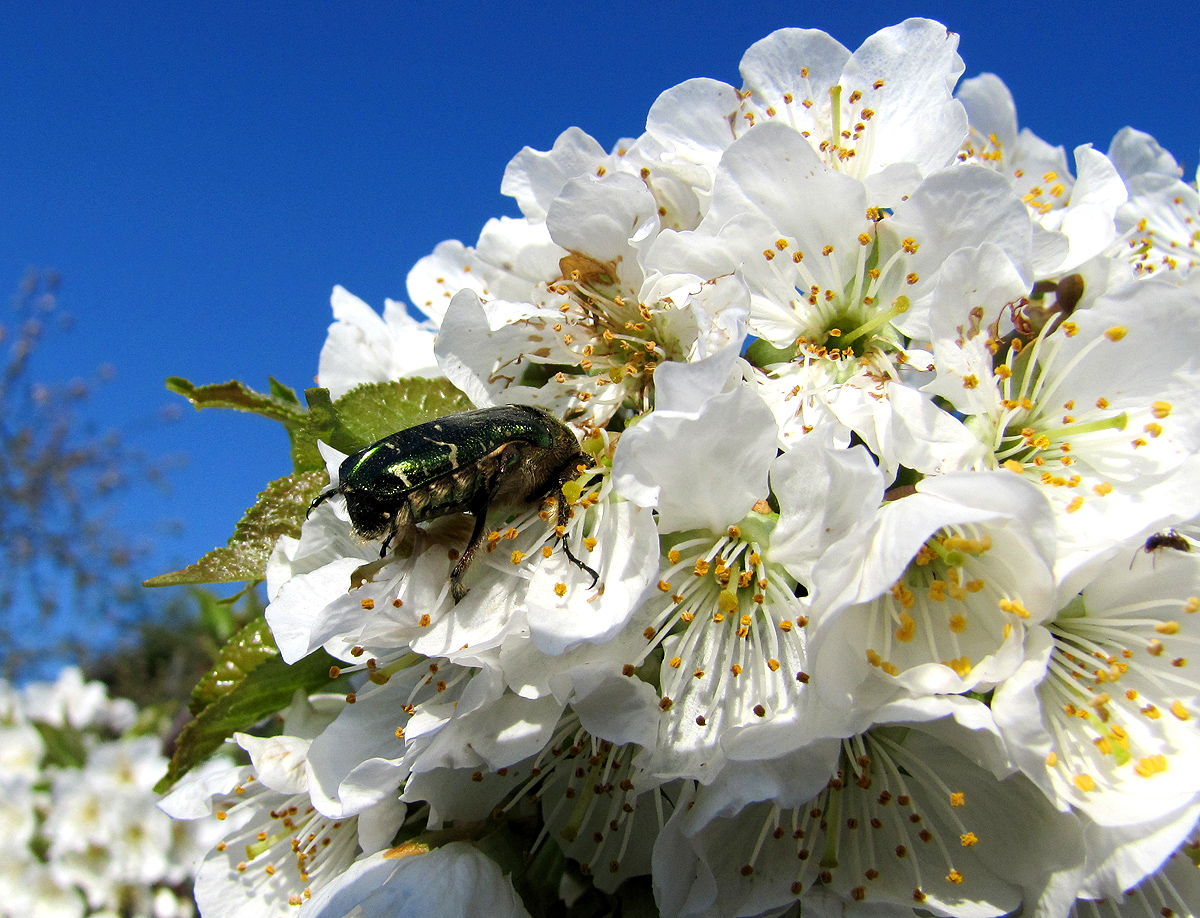 Ein Rosenkäfer besucht einen blühenden Kirschbaum. Bestäubung hat er allerdings nicht im Sinn: Er tut sich gütlich an einem Fruchtknoten.