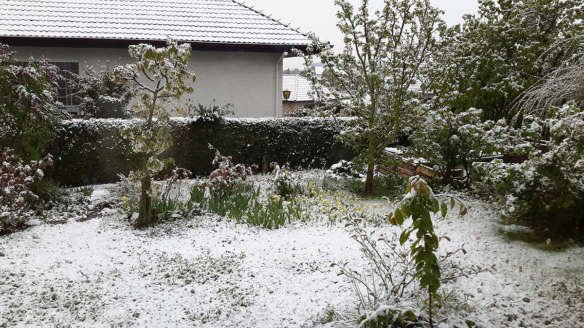 Nein, kleiner Scherz! Solche Wetterkapriolen wie der Schnee heute früh, in die Kirsch- und Apfelblüte hinein, gehören zum