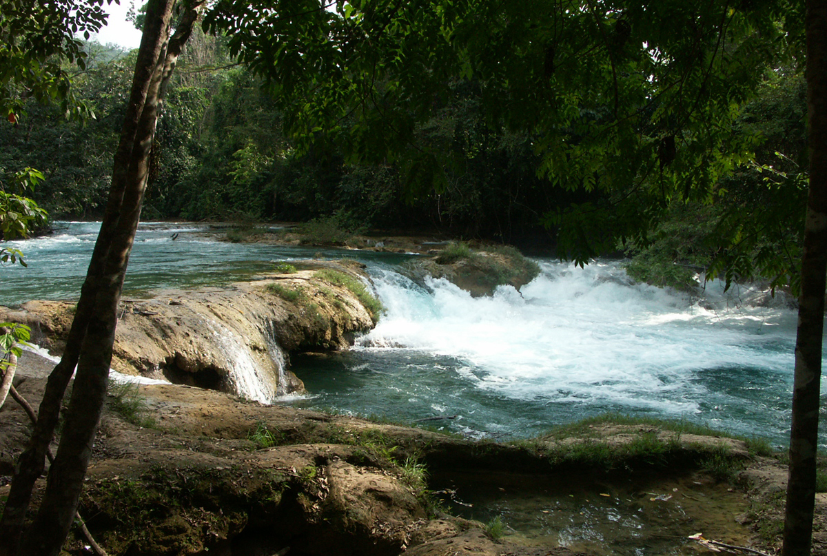 ... weg von unserem nassen und kühlen Mai, hin zu Badefreuden im März 2004, in den Wasserfällen Aguas azuls in Mexiko, auf der Halbinsel Yucatan!