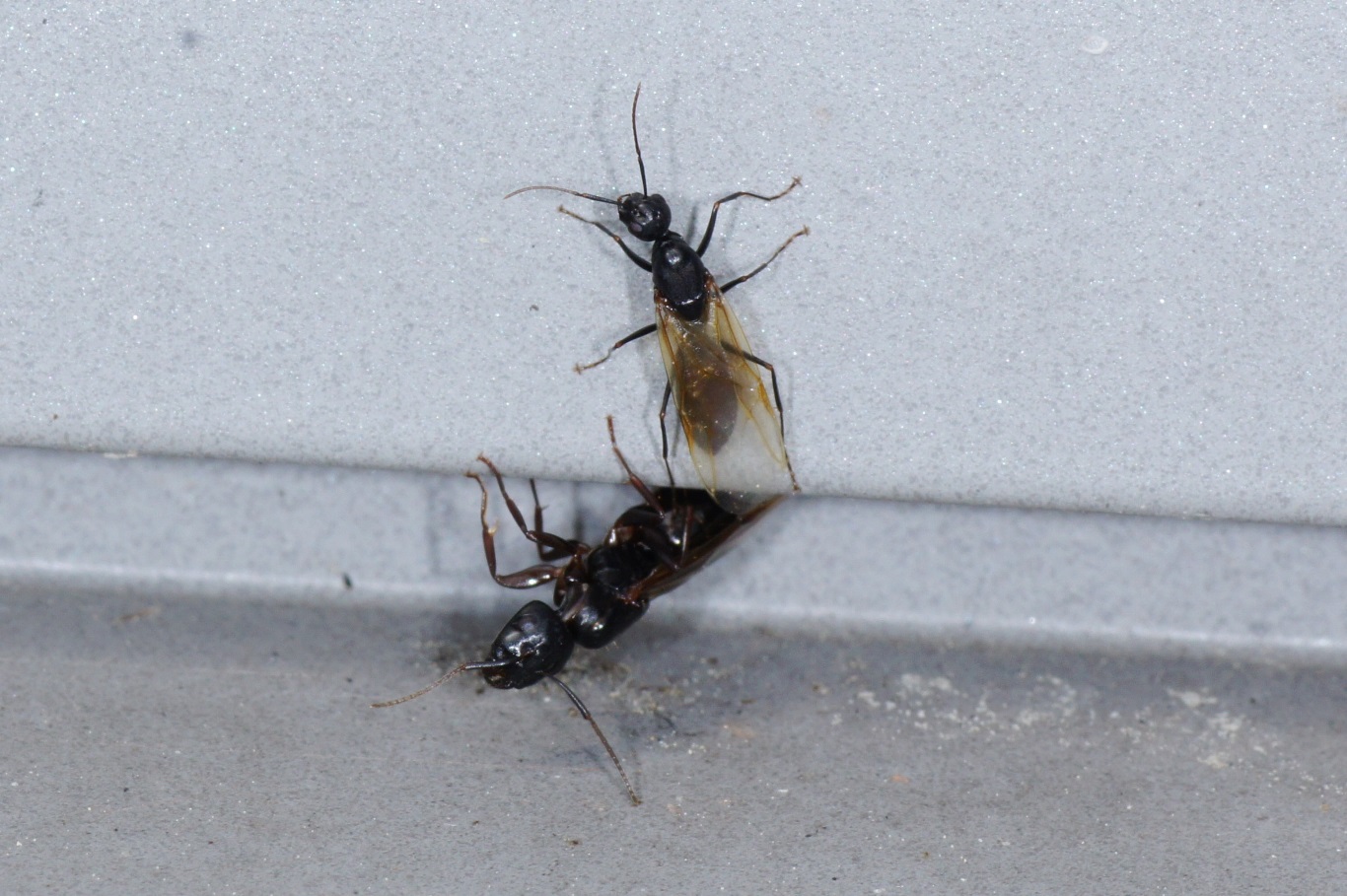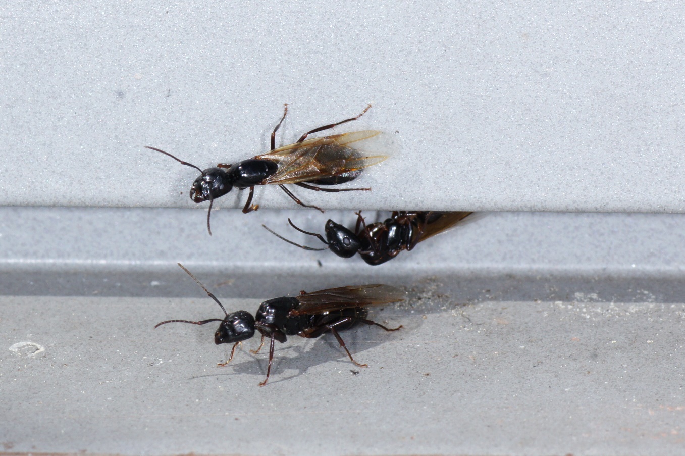Camponotus fallax, seit langem geduldete Hausbewohner, wollen aus dem ostseitigen Fensterstock schwärmen! Ob das was wird, weiß ich nicht, gerade verdeckt wieder eine Wolke die Sonne....