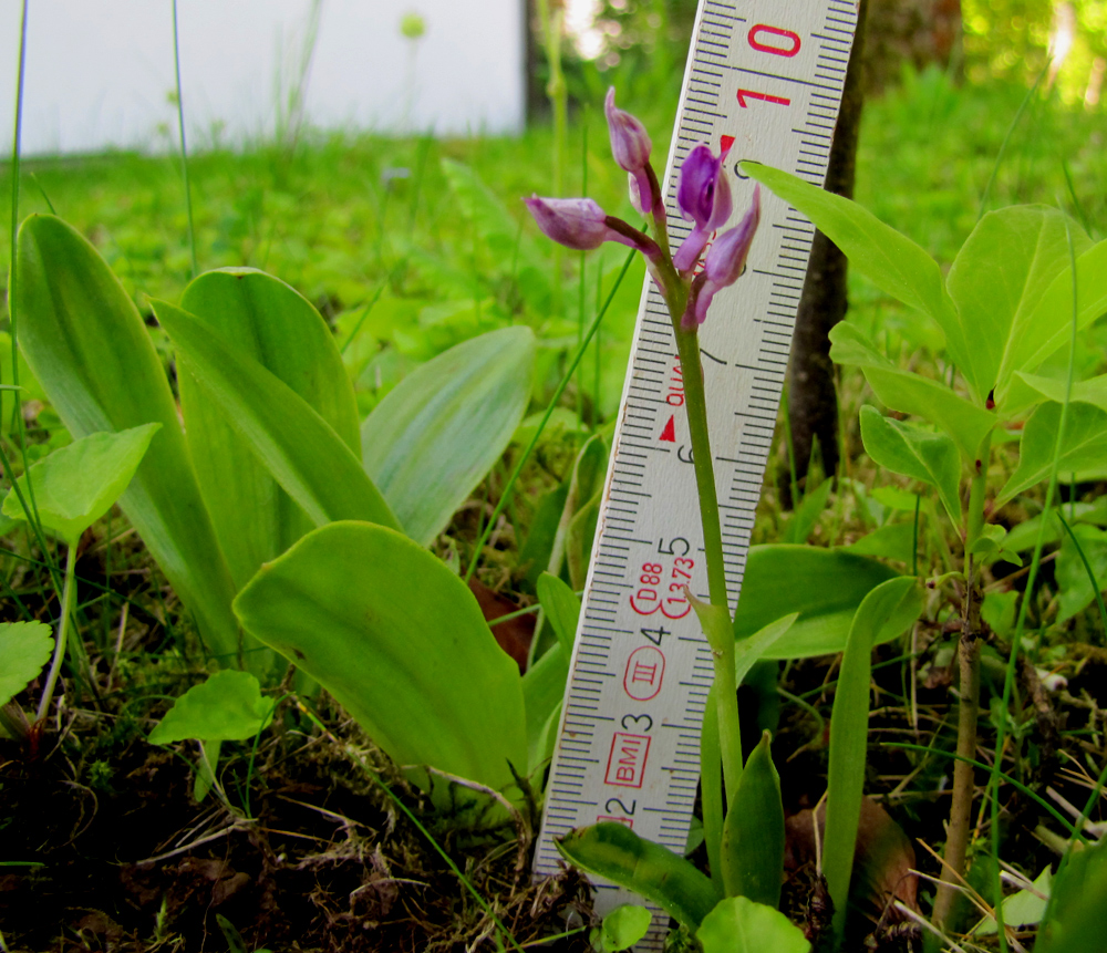 Exemplaren von Orchis militaris ein ganz winziges, aber blühendes Pflänzchen von knapp 10 cm Höhe.