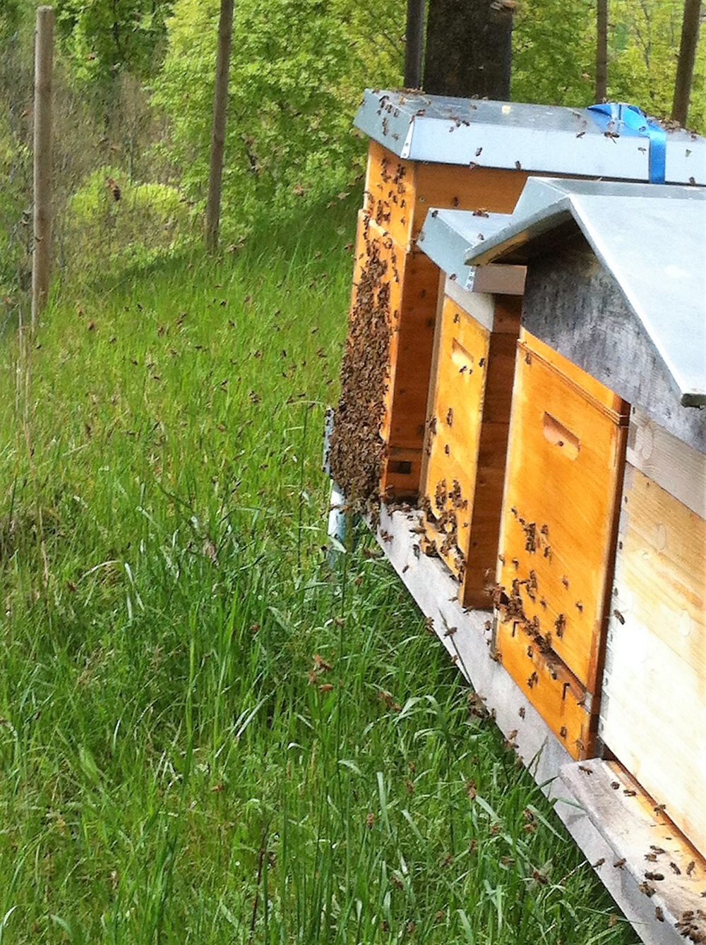 Die Bienen im Stock ganz hinten wollen offenbar schwärmen. Der Flugbetrieb ist massiv zurückgegengen, dafür fliegen sie zögerlich vor der Beute auf und ab oder hängen an der Front rum. Offenbar verhindert aber das eher schlechte Wetter (wechselhaft, immer wieder Regen), dass die alte Königin mit einem Teil der Bienen den Stock verlässt. Bienen schwärmen meist um die Mittagszeit. Sie bilden dann ganz in der Nähe des Stockes einen Traube und verharren so wenige Tage, bis die Späherinnen einen geeigneten Unterschlupf (z.B. Baumhöhle) gefunden haben.