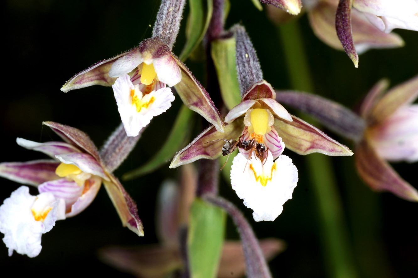 Auch der Nektar etlicher Orchideen ist bei Ameisen sehr beliebt: Stendelwurz (Epipactis palustris) mit Formica fuscocinerea