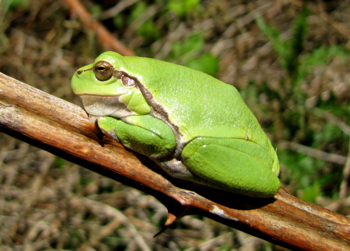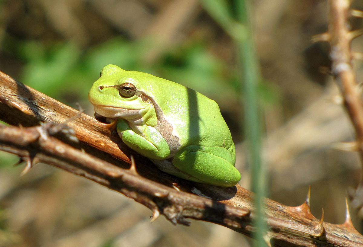 im Uferbereich der Gersprenz ein smaragdgrünes Etwas ins Auge: Ein echter Laubfrosch!