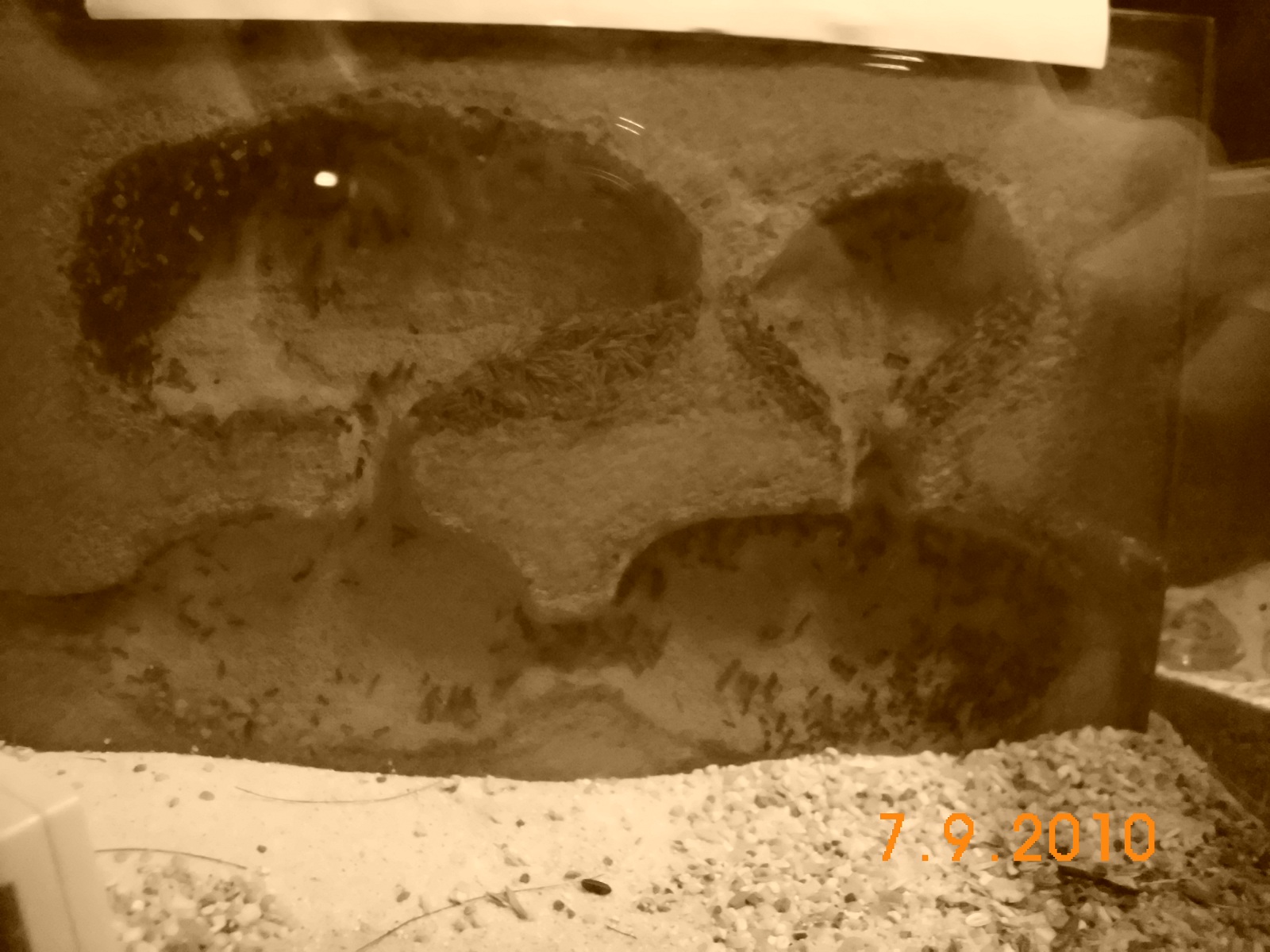 Als ich heute nach Hause kam konnte ich sehen, wie eine Arbeiterin sich durch ein fast unsichtbares kleines Loch in der Ecke des dritten Formikariums durchzwängt. Das Loch ist in dem Aquariensilikon unten in einer Ecke. Beim ausleuchten mit meiner Lampe sind die drei Arbeiterinnen, welche draußen waren, schnell wieder in das Becken geflüchtet. Als Notlösung habe ich erst einmal Panzertape über das Loch gemacht. Dieses sieht man auch auf dem zweiten Bild. Da ich mir bald ein neues großes Becken hole, werde ich das alte dann wohl abmachen und erst einmal neu kleben müssen. Das wichtigste, nämlich das Schlupfloch, wurde entdeckt und zu gemacht .