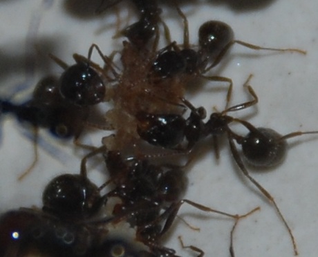hier erst einmal ein paar neue Bilder. Auf dem Bild ist einiges los, da ich gerade wieder Schinkenstücken gefüttert habe. Diese gehen weg wie warme Semmeln und während des Eintragens und auch danach war das gesamte Terrarium voll mit Arbeiterinnen.