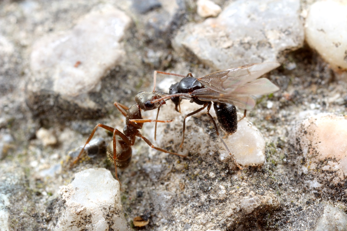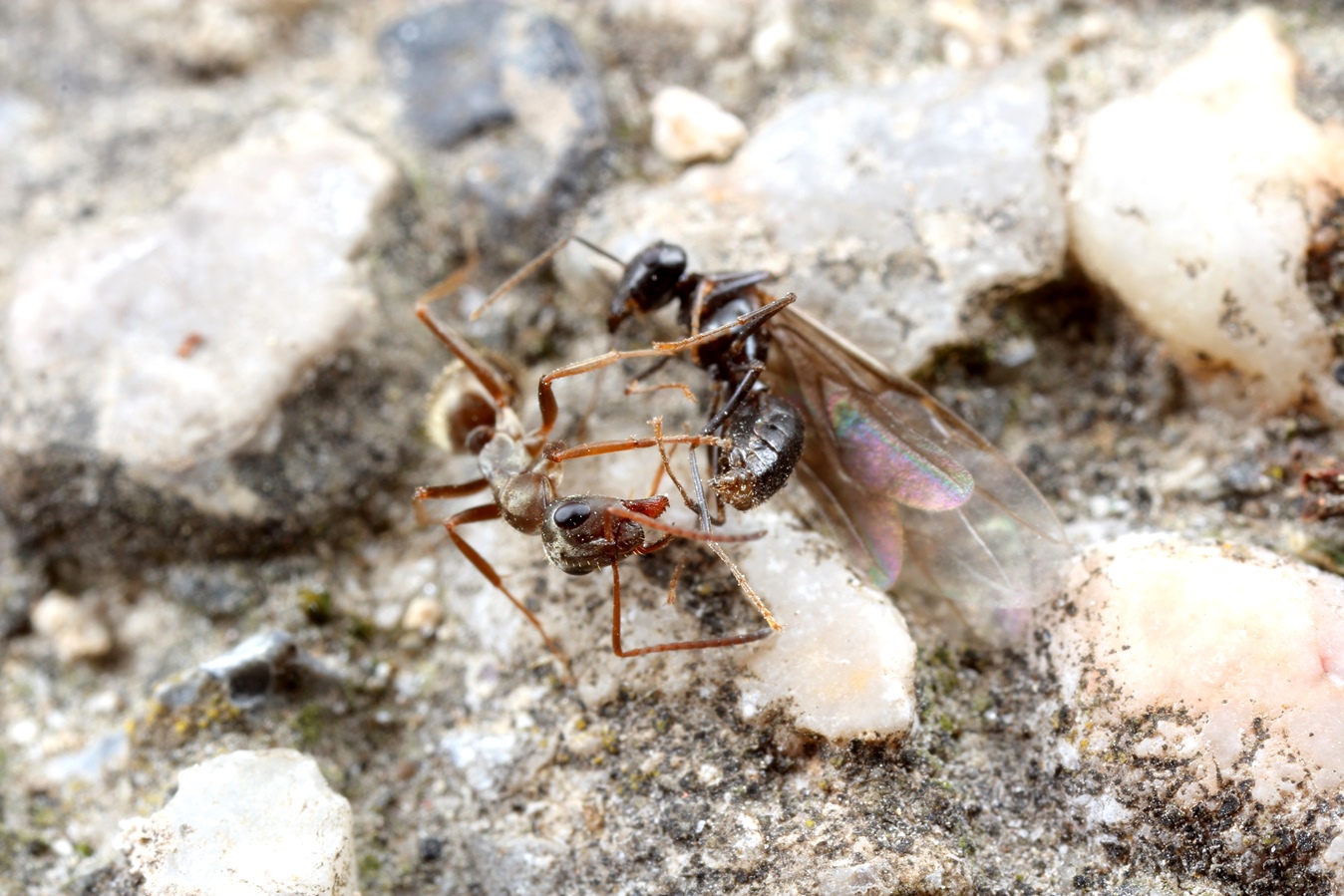 1. Auf den Waschbetonplatten des Gehweges ein schon geschwächtes alates Männchen von Lasius fuliginosus (die schwärmen schon seit 2 Wochen immer wieder) wird Opfer einer Formica fuscocinerea. Hoffentlich hatte das Opfer vorher seine "Pflicht" erfüllt!