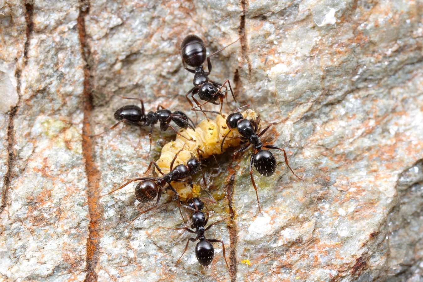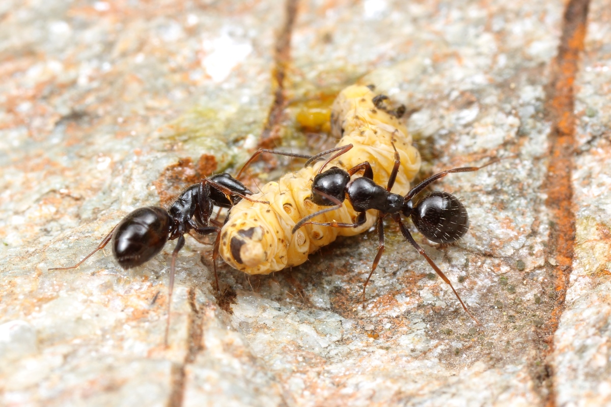 2. Fütterung bei Camponotus piceus im Steingarten mit einer Raupe. Die Kommunikation ist bei dieser Art nicht gut entwickelt: Die Rekrutierung geht schleppend voran, überhaupt kein Vergleich etwa zu Lasius niger od. L. emarginatus!