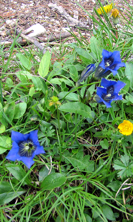 1-Der Frühlings-Enzian (Gentiana verna), auch Schusternagerl, Schusternägele, Rauchfangkehrer, Himmelsbläueli, Herrgottsliechtli, Tintabluoma oder Himmelsstengel genannt, ist eine der kleinsten Pflanzenarten der Gattung Enziane (Gentiana). Hier am Rif. Son Forcia (2200 m), an der Seilbahn zum Monte Cristallo.