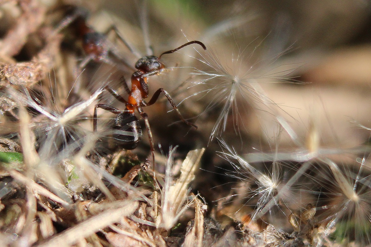 Etliche Nester von Formica foreli zeigten im August 2016 eine in dieser Intensität sonst nicht zu sehende Besonderheit. Die Ameisen hatten im Zeitraum vom 08. bis 15.08.2016 Mengen Haarschöpfe/Flughaare von Reitgras (Calamagrostis) auf die Hügel getragen. Als dann die Sommerhitze am 26./27.08 auf über 32°C stieg, habe ich mich mit Thermometer ausgerüstet und konnte direkt über dem Nesthügel 42°C, aber im "wärmegedämmten" Nestkegel 37°C messen.