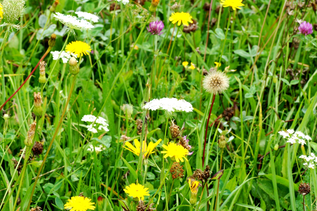 Wiesenblumen: Rotklee, Wilde Möhre, Habichtskraut, in der Mitte unten der Große Bocksbart (Trapogon dubius)