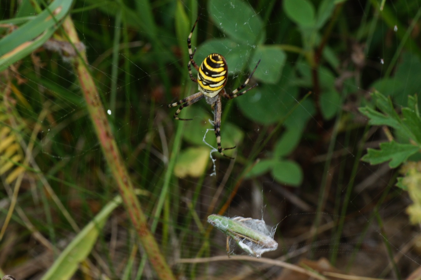 Wespenspinne mit eben eingewickelter Beute