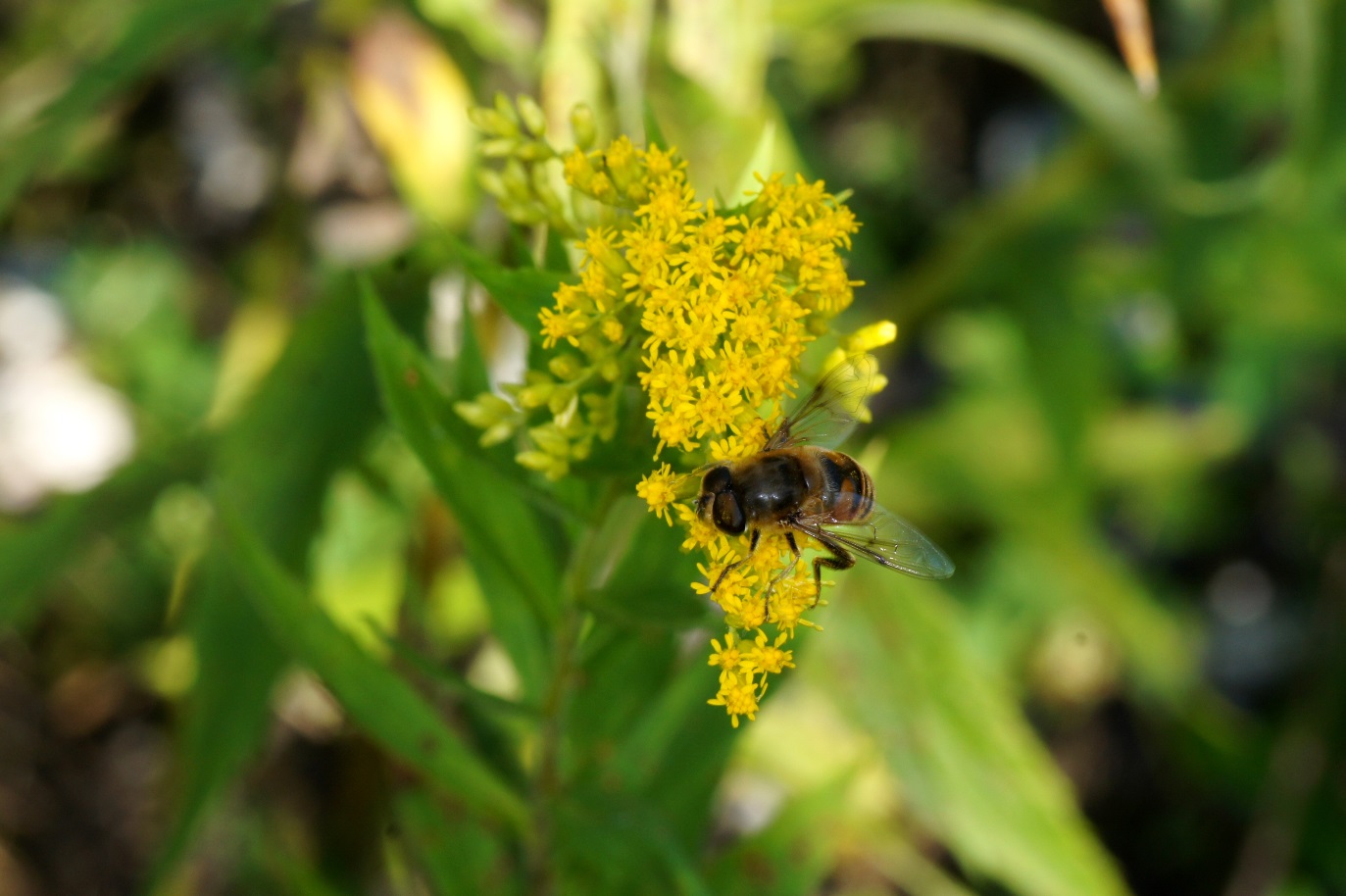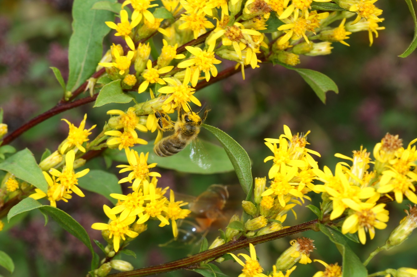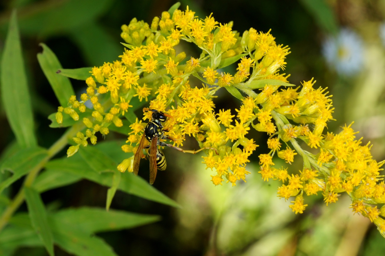 Die Goldrute ist zwar ein Neophyt, aber sehr wertvoller Nektarlieferant für zahlreiche Insekten. Hier eine Schwebefliege
