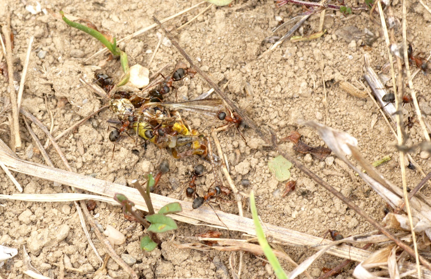 Leider ist ein Heuschreck unter die Schuhe geraten, Beute für Formica rufibarbis