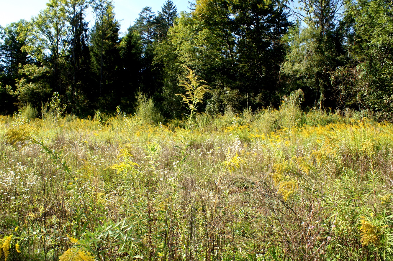 Ruderalfläche mit Goldrute (Solidago), Sommerflieder (Buddleja sp.), Weidenröschen (Epilobium sp.), Wilder Möhre (Daucus carota), Rainfarn (Tanacetum sp.), Echtem Labkraut (Galium verum) u. a. Sukzession d. Rotföhre u. Weide