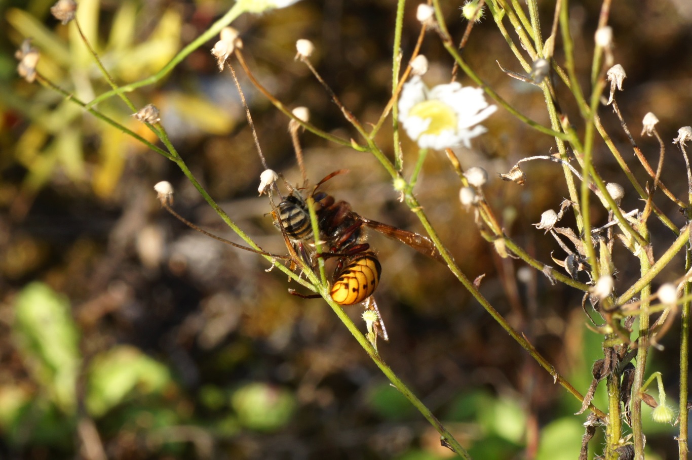 eine Hornisse hat vor uns ein Insekt erbeutet, ich vermute eine Schwebefliege