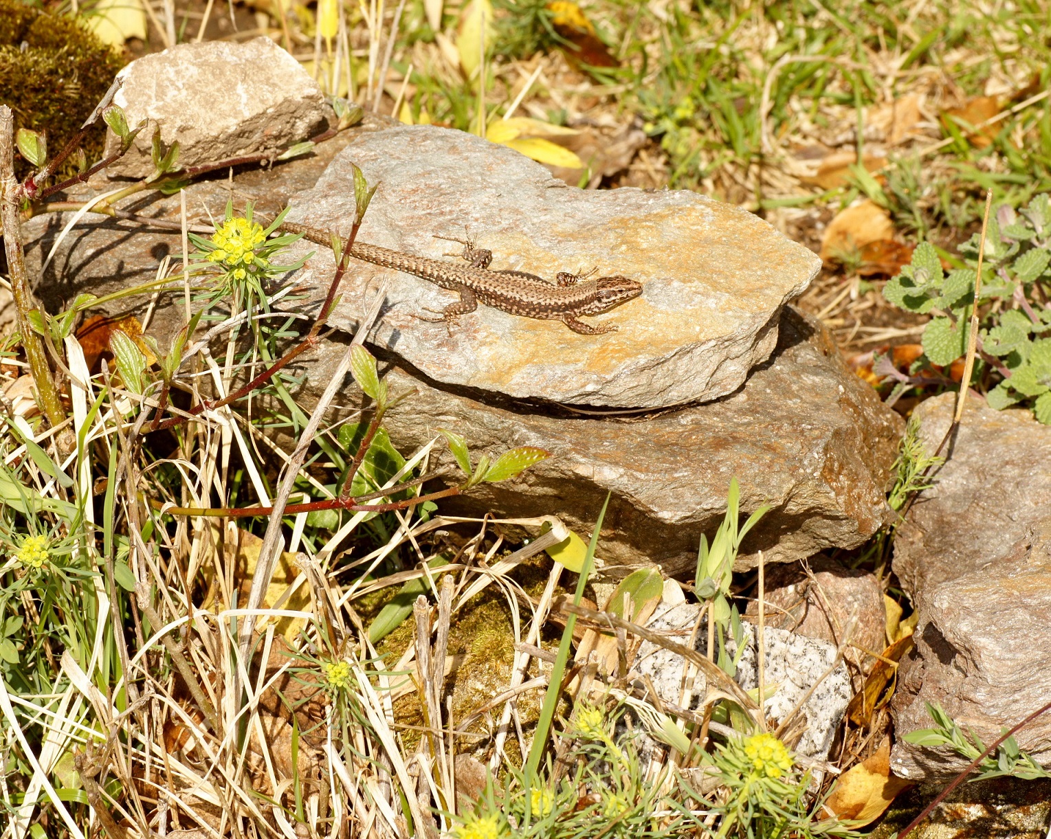 Die Mauereidechse ist nach der FFH-RL der EU eine streng geschützte Art, in Österreich auf der Roten Liste und streng geschützt. Gestern habe ich im Steingarten gleichzeitig 3 Eidechsen beobachtet, davon 2 Jungtiere.