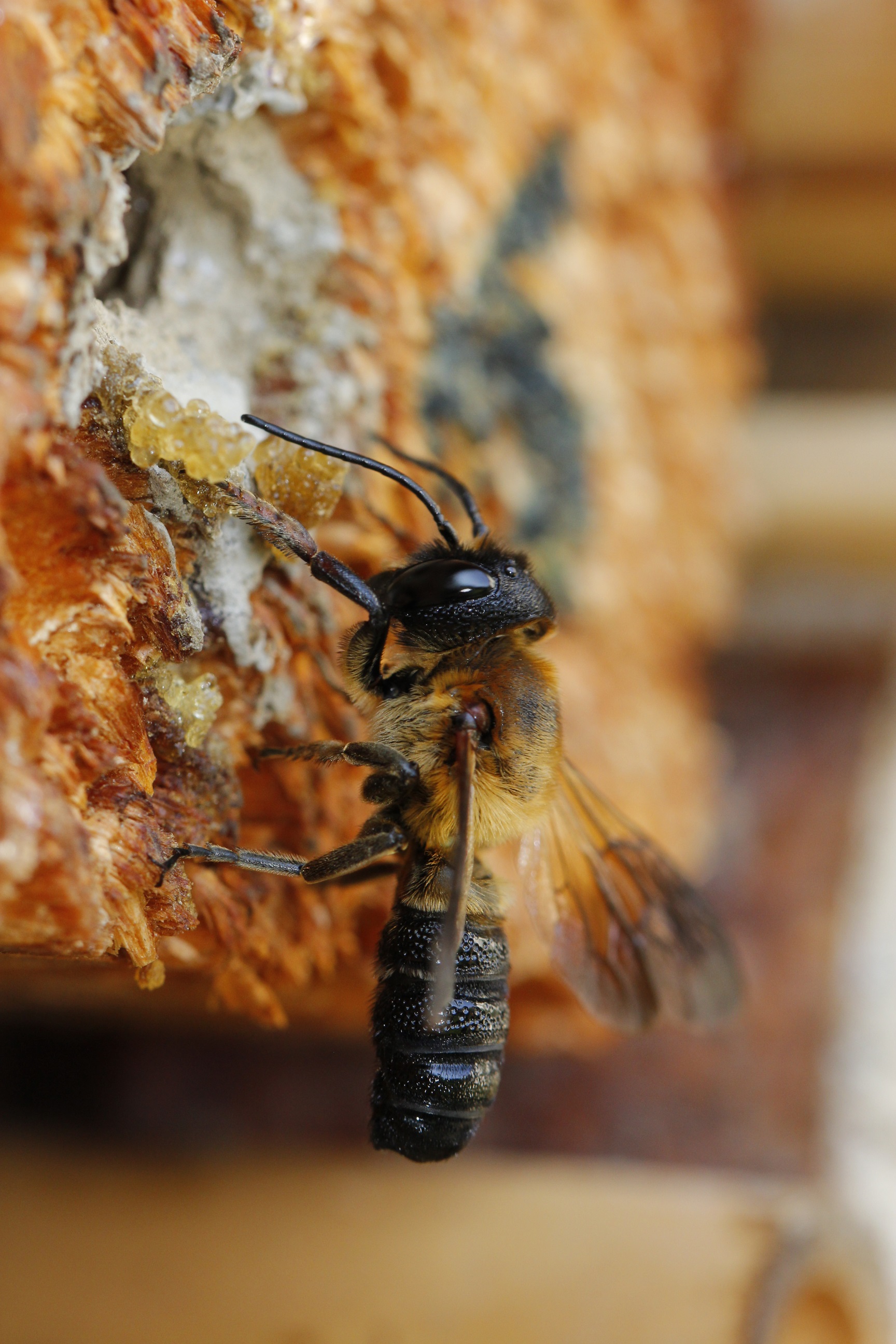 Heute befasse ich mich mehr mit den Männchen oder der Kopulation und den damit zusammenhängenden Ereignissen: Die Bienenart, aus dem Englischen auch als "Harzbiene" bekannt, kommt inzwischen in allen österr. Bundesländern vor, die dichteste Besiedlung gibt es im Rheintal und Bodenseegebiet des Bundeslandes Vorarlberg; das hat übrigens mit der Schweiz und Deutschland zu tun, die meisten Sichtungen Mitteleuropas gibt es im Bodenseegebiet.