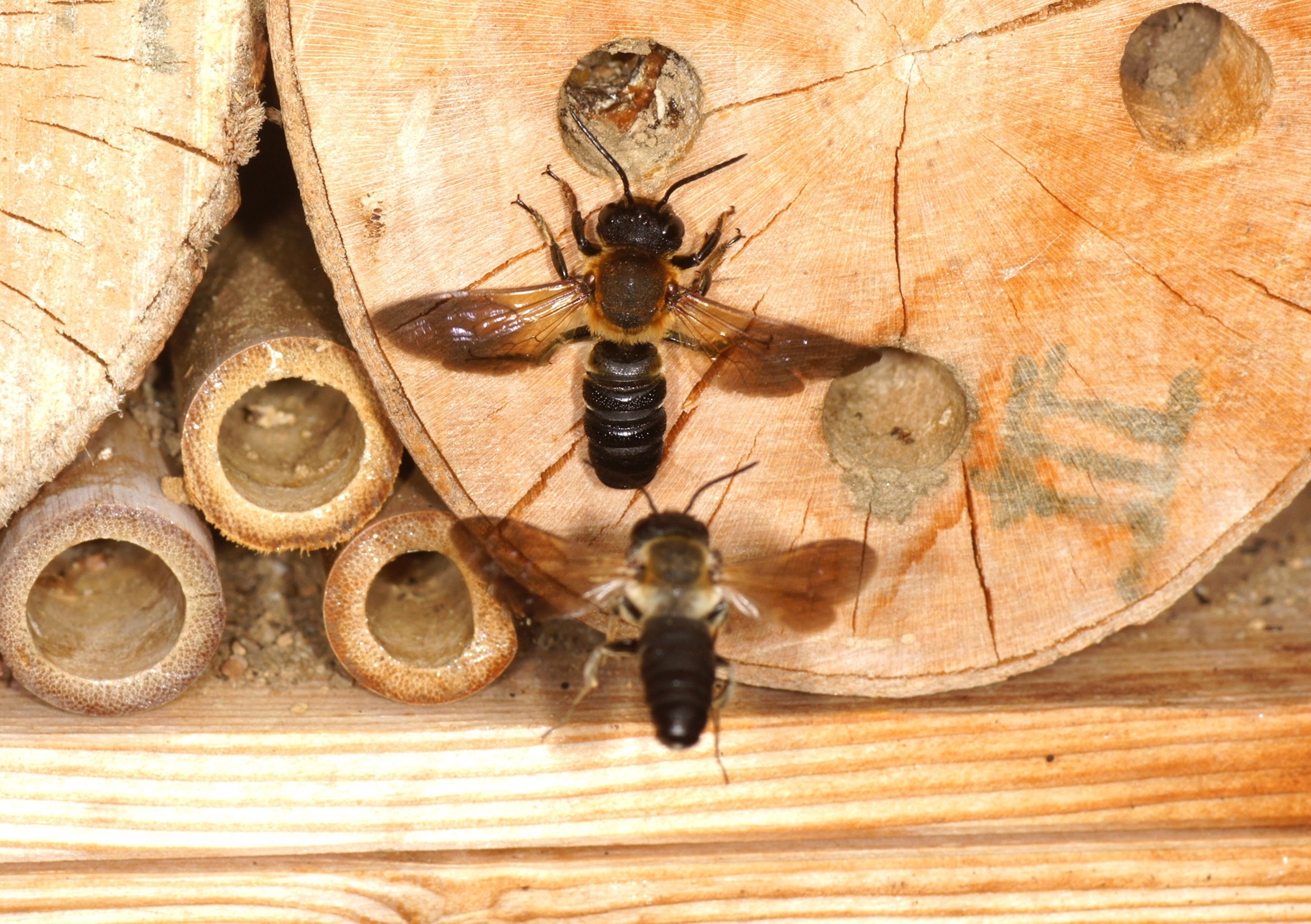Ich beobachte die Bienenart jetzt das dritte Jahr, nach dem Wetter-Katastrophenjahr 2023 habe ich mir für 2024 nicht viel erwartet. Tatsächlich hatte ich in meinem Insektenhotel Anfang September immerhin 21 äußerlich versiegelte Wohnröhren. Die jetzigen Erfahrungen haben mich belehrt: Trotz der Länge der Wohnröhren von 10 cm in Holz und etwa 15-17cm langen Bambusröhren, wird offenbar in den meisten Wohnröhren nur eine od. viell. eine zweite Brutzelle im hinteren Bereich angelegt. Warum die Bienen hier so "zurückhaltend" sind, weiß ich noch nicht. M. sculpturalis ist ein Neozon aus Ostasien stammend, dem starke Vermehrung und invasives Potential zugeschrieben werden.