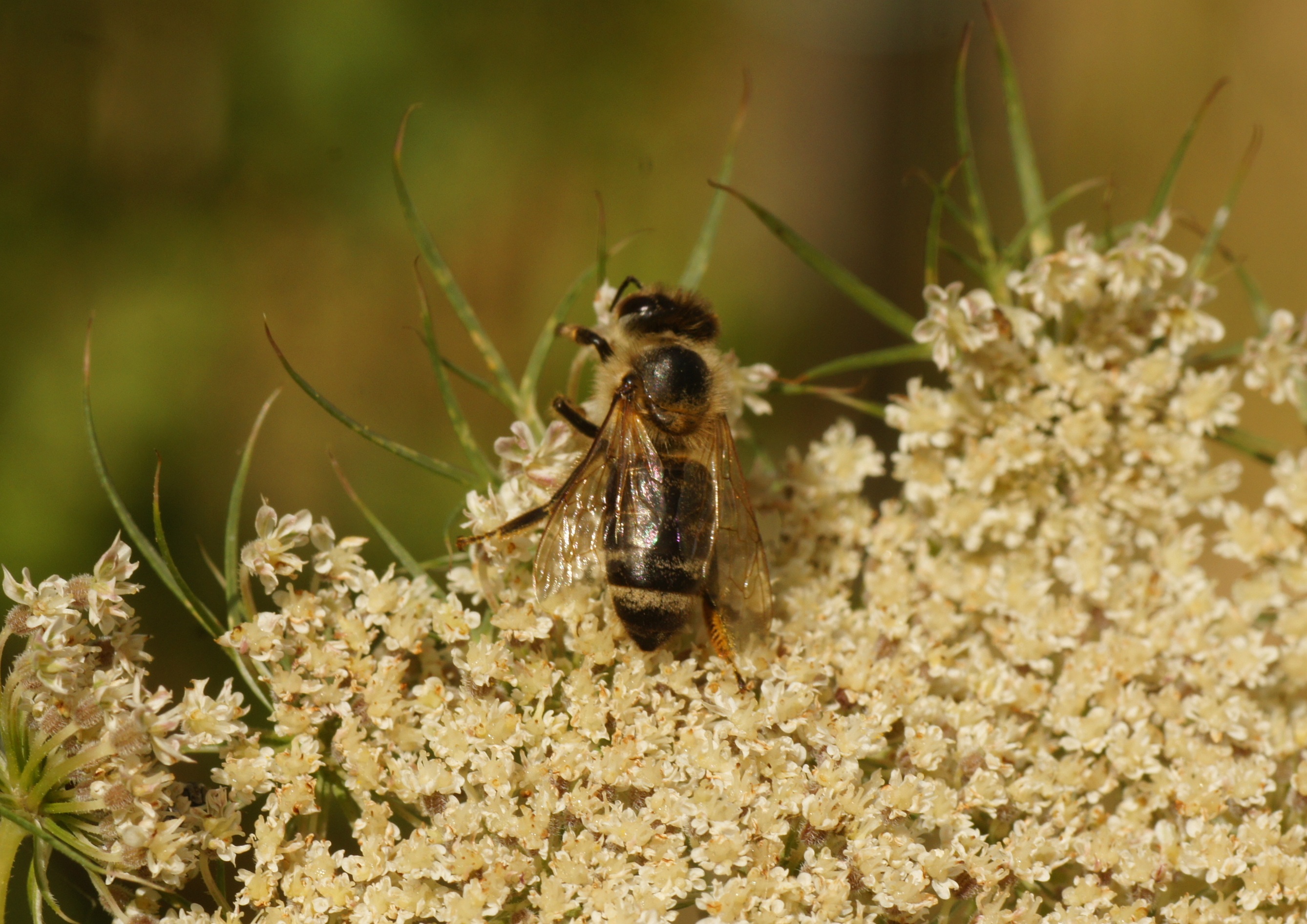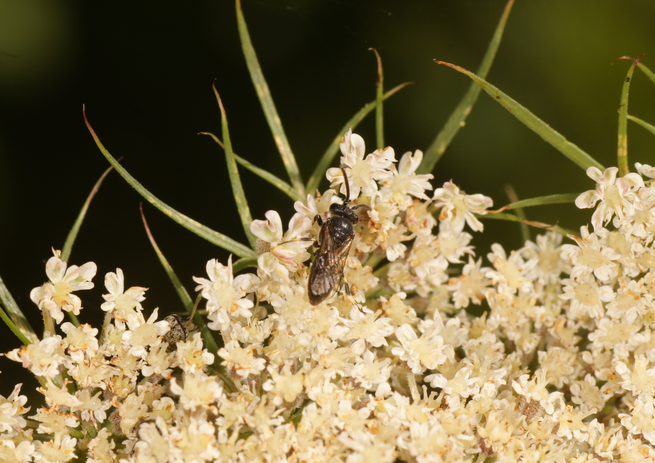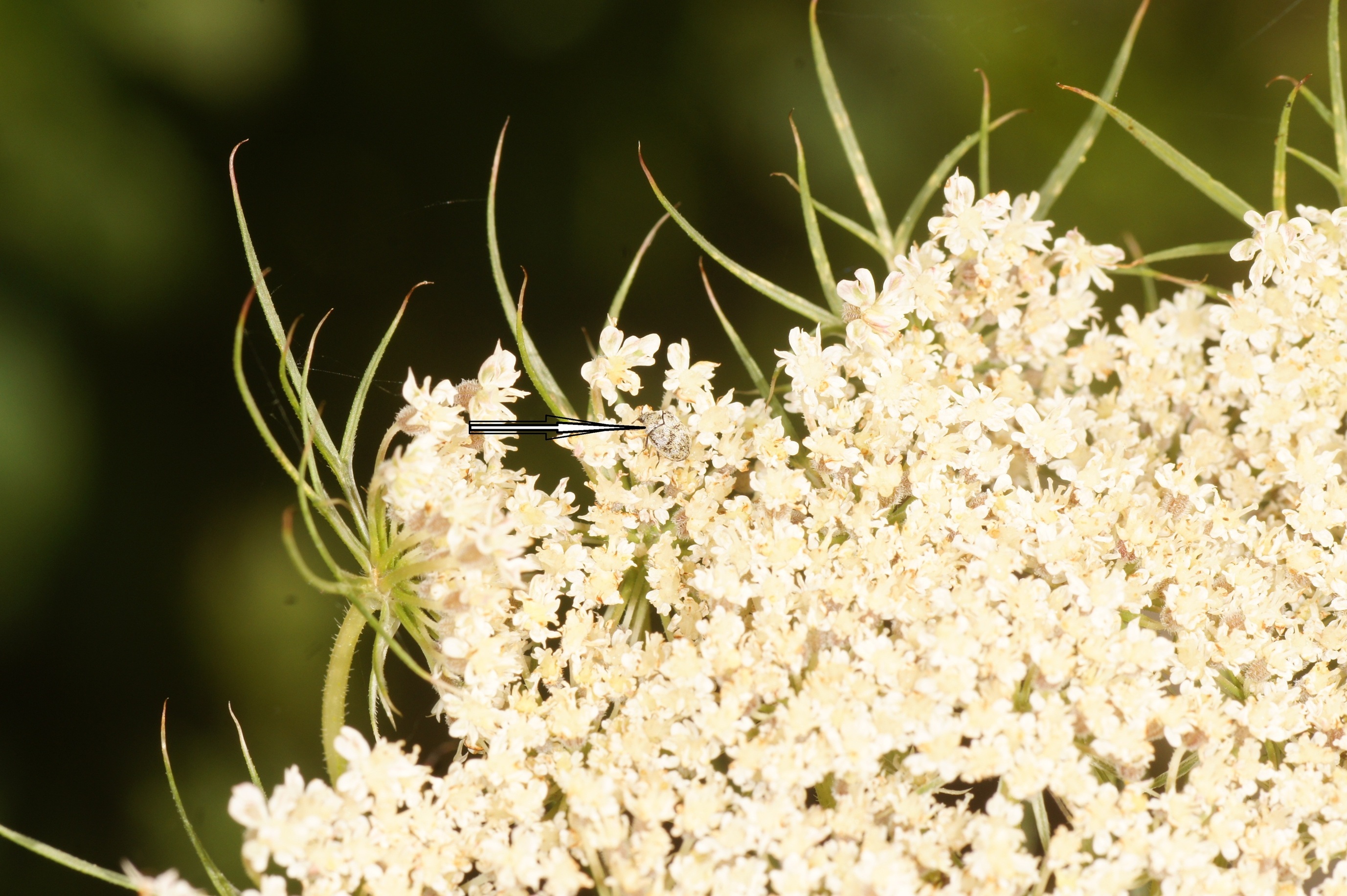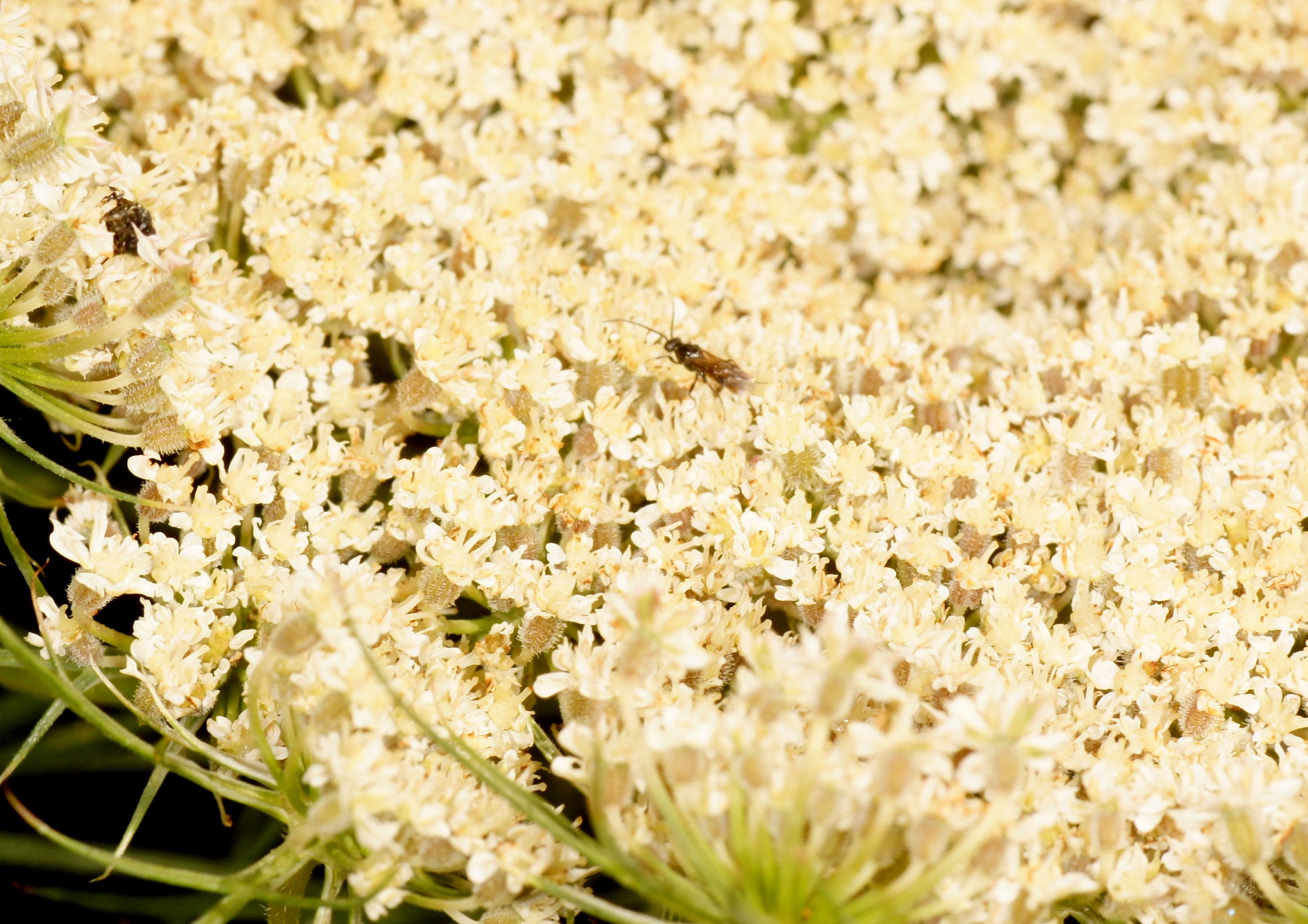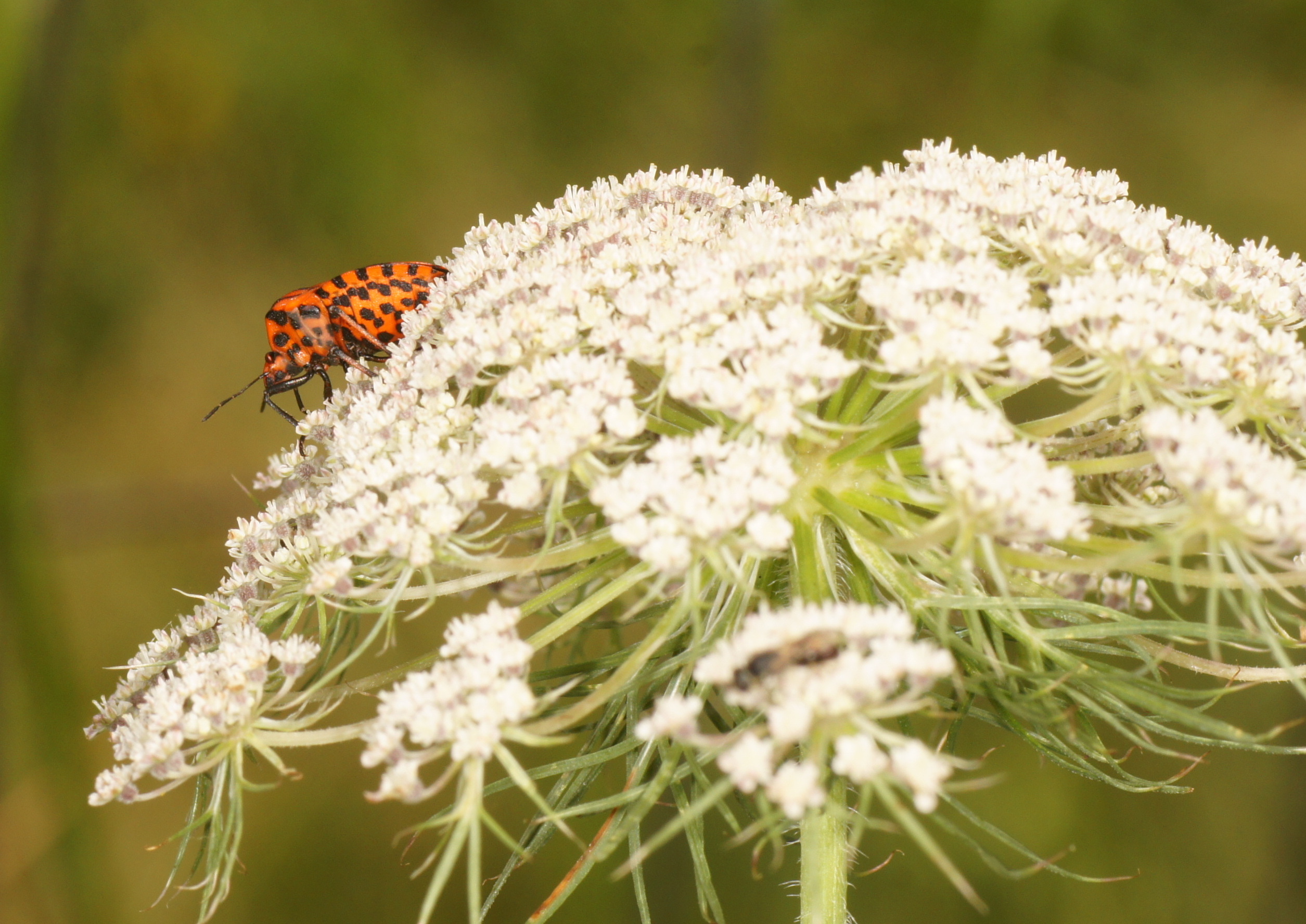 Im Hochbeet hatte ich im vorigen Jahr eine Karottenpflanze vergessen (Daucus carota). Heuer hat sie ausgetrieben und besitzt 3 Blütendolden. Welche Besucher sich da wohl einfinden?