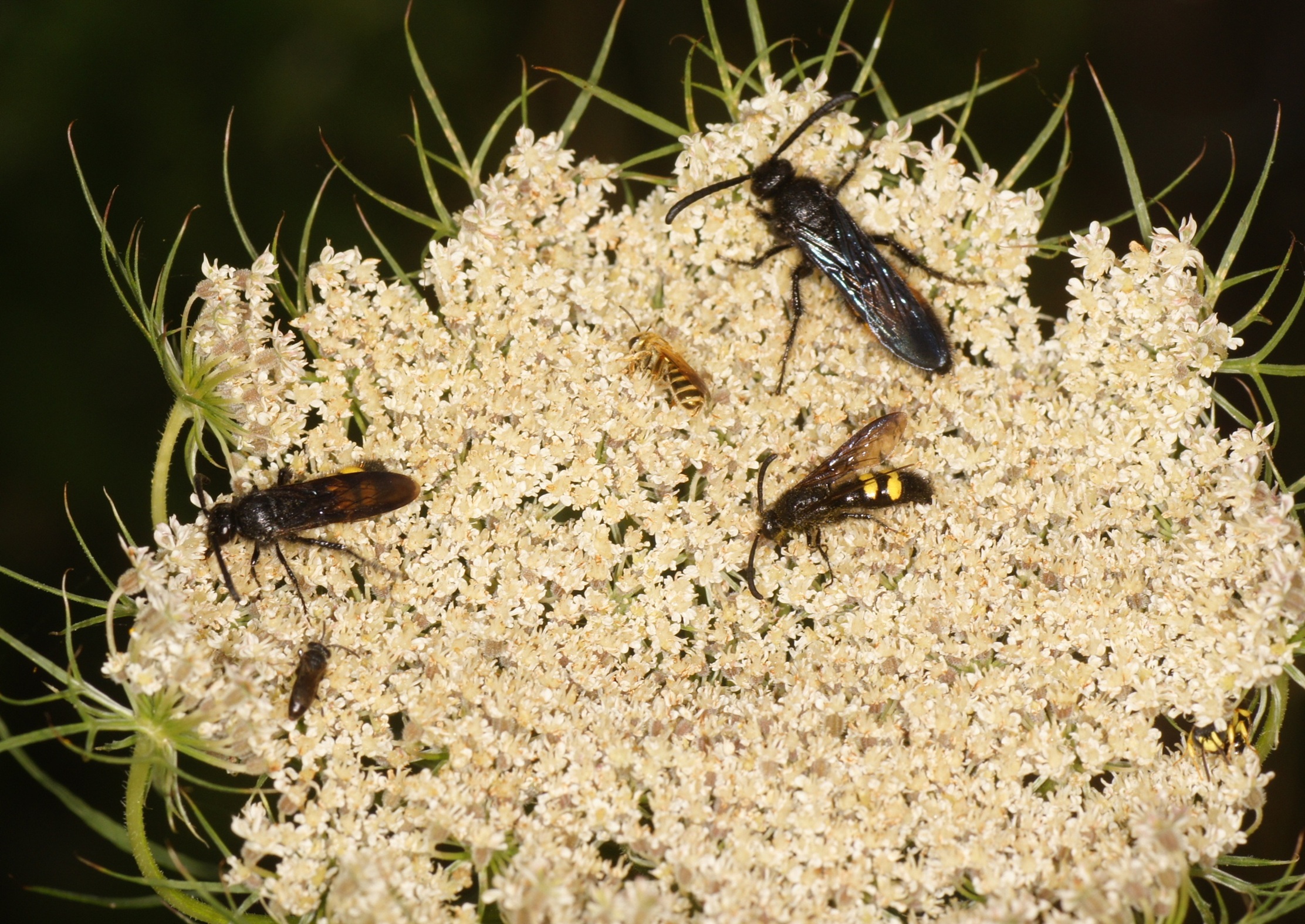 mehrere Insekten, darunter 3 unterschiedlich große Männchen der Dolchwespe Scolia hirta