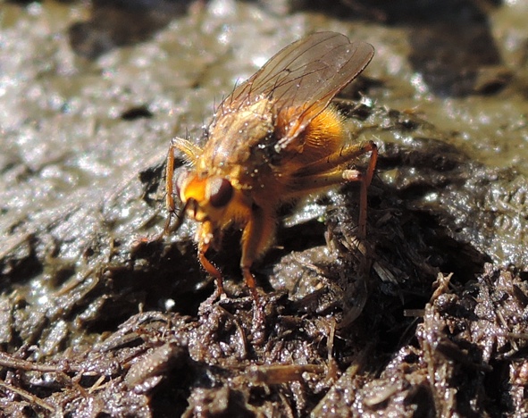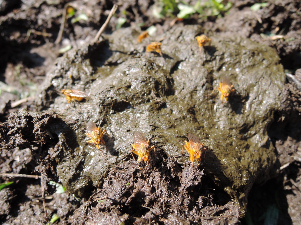 Das sind, mit an Sicherheit grenzender Wahrscheinlichkeit, "Dungfliegen" (Scatophaga stercoraia). Bei uns im Volksmund heissen die einfach "Mistfliegen". So wie die Raupe des Schwalbenschwanzes "Rüebliraupen" (Rüebli = Karotten) und der Mäusebussard "Hühnervogel"... Ganz nach dem Motto du bist, was du isst. :fettgrins: