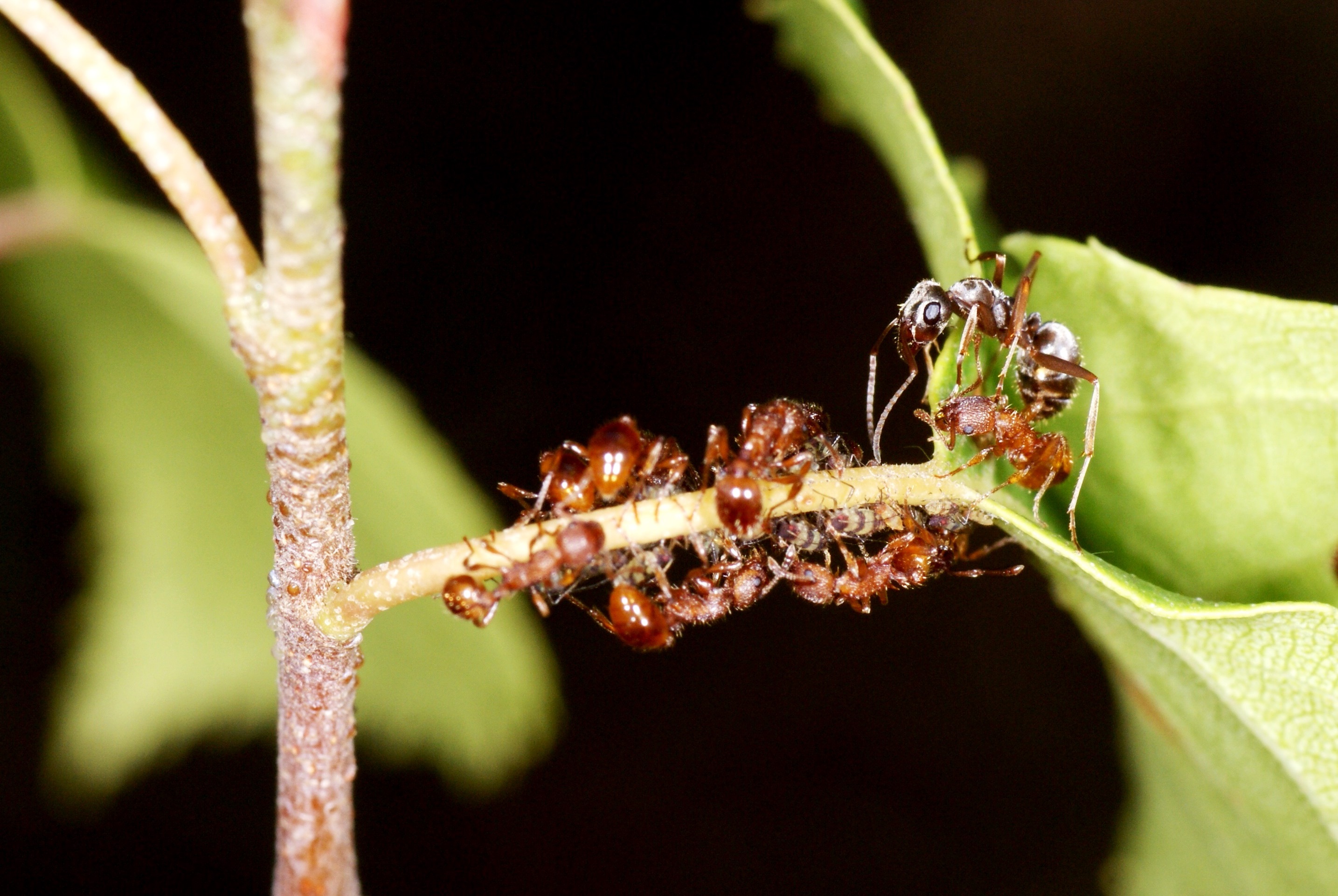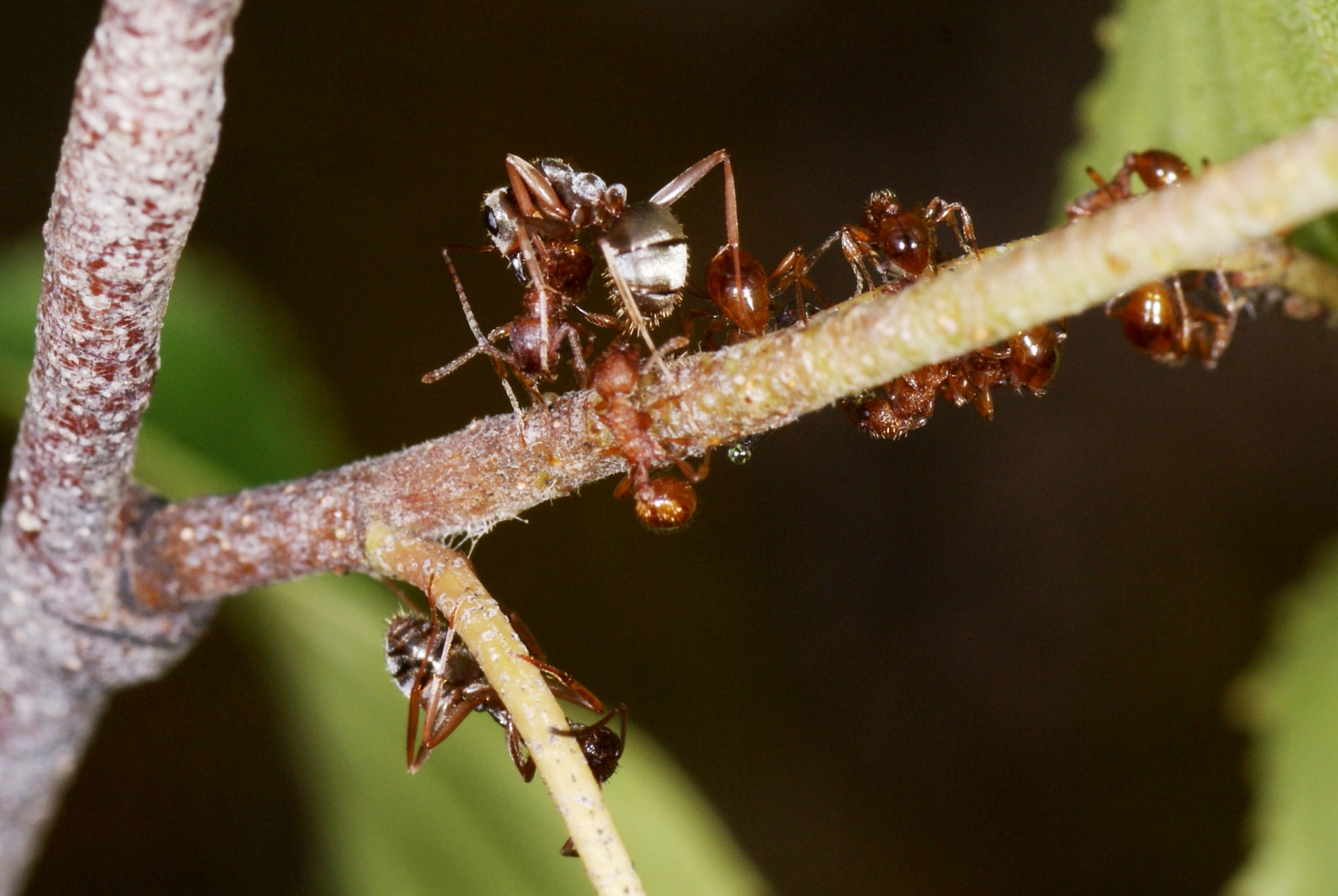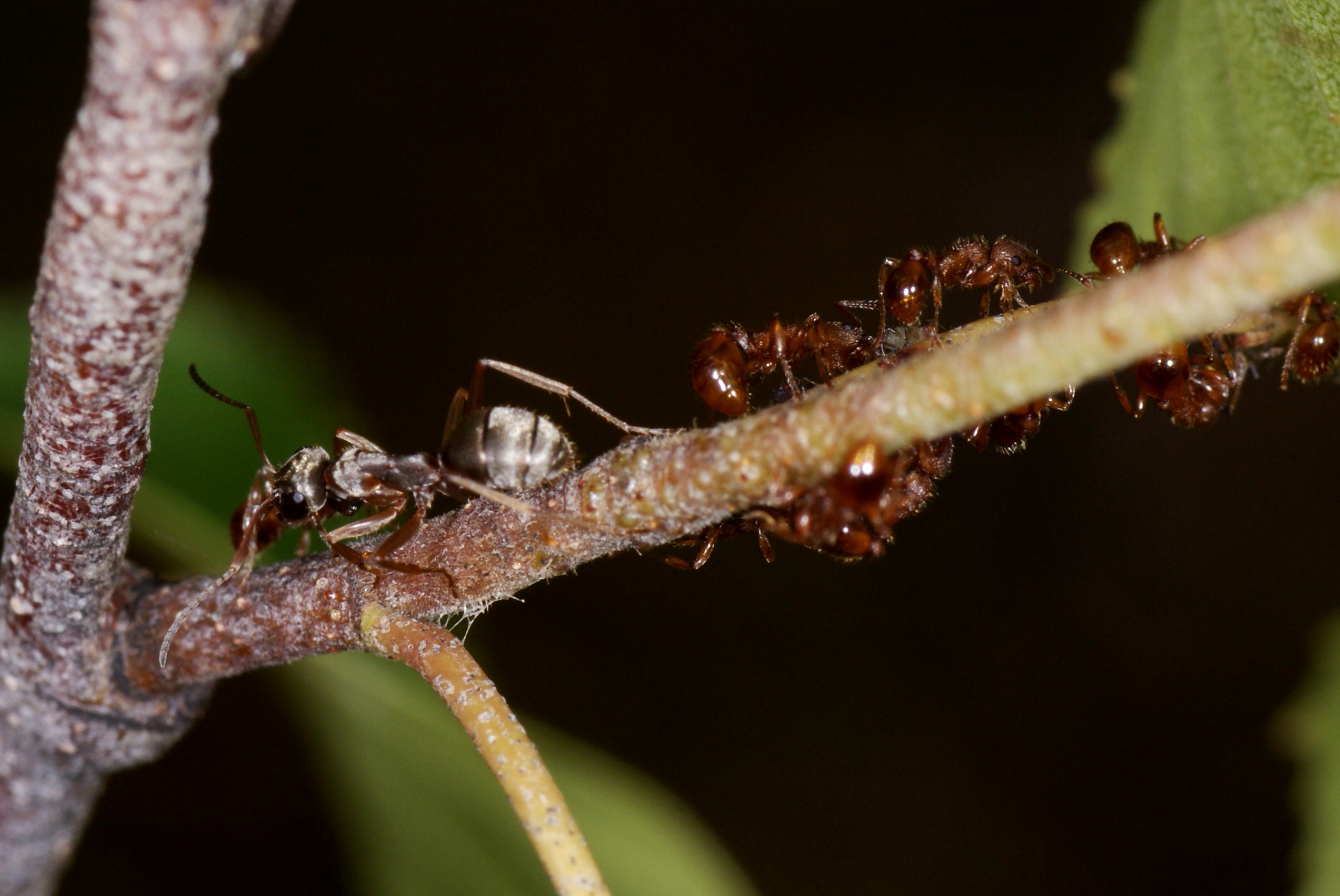 Schon vor ein paar Jahren konnte ich eine seltsame Interaktion zwischen Formica fuscocinerea und Myrmica sp. (damals nicht bestimmt!) beobachten, die auch im alten AF vorgestellt wurde. Etliche Arbeiterinnen v. Myrmica sp. betreuten Blattläuse auf einer Pflanze; nichts ungewöhnliches, aber einige Arbeiterinnen f. Formica fuscocinerea spazierten dazwischen, versuchten das eine od. andere Mal eine Myrmica aufzuheben und wegzutragen um sie dann nach wenigem cm wieder abzusetzen. Die Vermeidungsstrategie der Myrmica sp. bestand in devotem Verhalten, es gab kein Anzeichen für Aggression od. Verteidigungsbereitschaft des Nahrungsplatzes. Wurde eine Myrmica belästigt oder aufgehoben, machte sie sich "steif" und verhielt sich ruhig. Die Formica ließen keine selbständige Nahrungsaufnahme erkennen, möglicherweise verhielten sie zögerlich, weil sie zahlenmäßig in der Unterzahl waren. Dann aber machte ich eine kuriose Entdeckung: Eine Formica fasste mit den Mandibeln eine Myrmica im Kopfbereich an und prompt würgte diese einen Futtertropfen hervor!